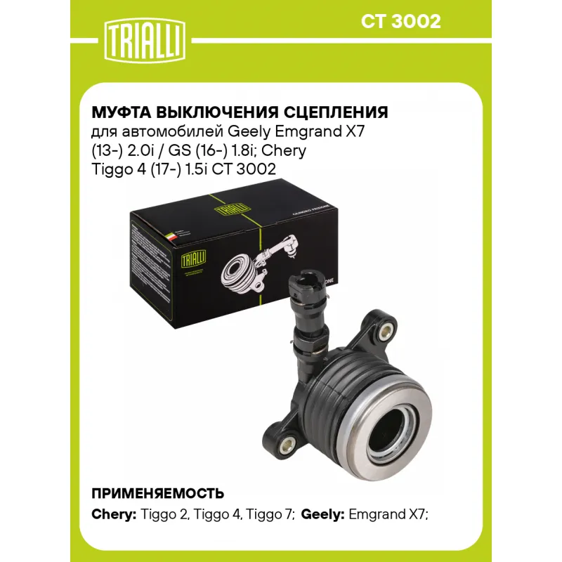 Муфта выключения сцепления для автомобилей Geely Emgrand X7 (13-) 2.0i / GS (16-) 1.8i; Chery Tiggo 4 (17-) 1.5i Характеристики: Артикул: CT 3002 OEM номера: 3013005700, 6600101850, 3013001800, 1016017608, 1016018592, 119000027AA Тип привода: гидравлический Гарантийный срок: 1 год/30 000 км Количество на автомобиль: 1 Сопутствующий товар: Комплекты сцепления: FR 2709, FR 2719 Товарная линейка: BLACK Подходит для авто: Chery Tiggo 2 (16-), Tiggo 4 (17-), Tiggo 7 (16-) Geely Emgrand X7 (13-) Для проверки применяемости отправьте VIN автомобиля через вкладку "Есть вопросы о товаре?" Комплектация: Муфта выключения сцепления в сборе (гидравлическая) - 1 шт Гарантия: от 1 года.