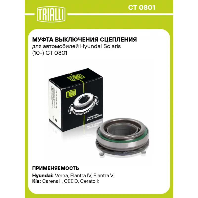 Муфта выключения сцепления для автомобилей Hyundai Solaris (10-) Характеристики: Артикул: CT 0801 OEM номера: 41421-23010, 41421-23020, 41421-32000, 41421-28000 Тип привода: механический Количество на автомобиль: 1 Сопутствующий товар: Комплекты сцепления: FR 0818, FR 0812 Гарантийный срок: 1 год/30 000 км Товарная линейка: BLACK Подходит для авто: Hyundai Verna (06-), Elantra IV (06-), Elantra V (11-), i20 (08-), i30 I (07-), i30 II (11-), i40 (11-), Sonata VI (YF) (10-), iX20 (10-), iX35 (10-), Solaris I (10-), Tucson III (15-), Veloster (11-) Kia Carens II (06-), CEE'D (12-), CEE'D (07-), Cerato I (04-), Cerato II (09-), Optima (11-), Rio II (05-), Rio III (11-), Soul I (08-), Soul II (14-), Spectra (00-), Sportage III (10-), Venga (10-) Для проверки применяемости отправьте VIN автомобиля через вкладку "Есть вопросы о товаре?" Комплектация: Муфта выключения сцепления в сборе - 1 шт Гарантия: от 1 года.