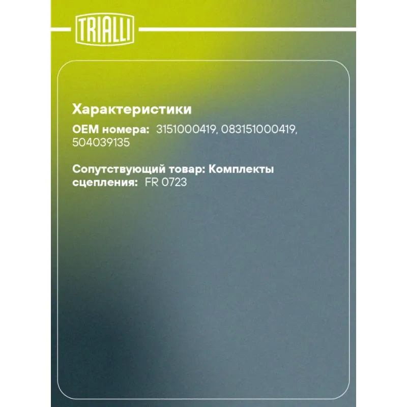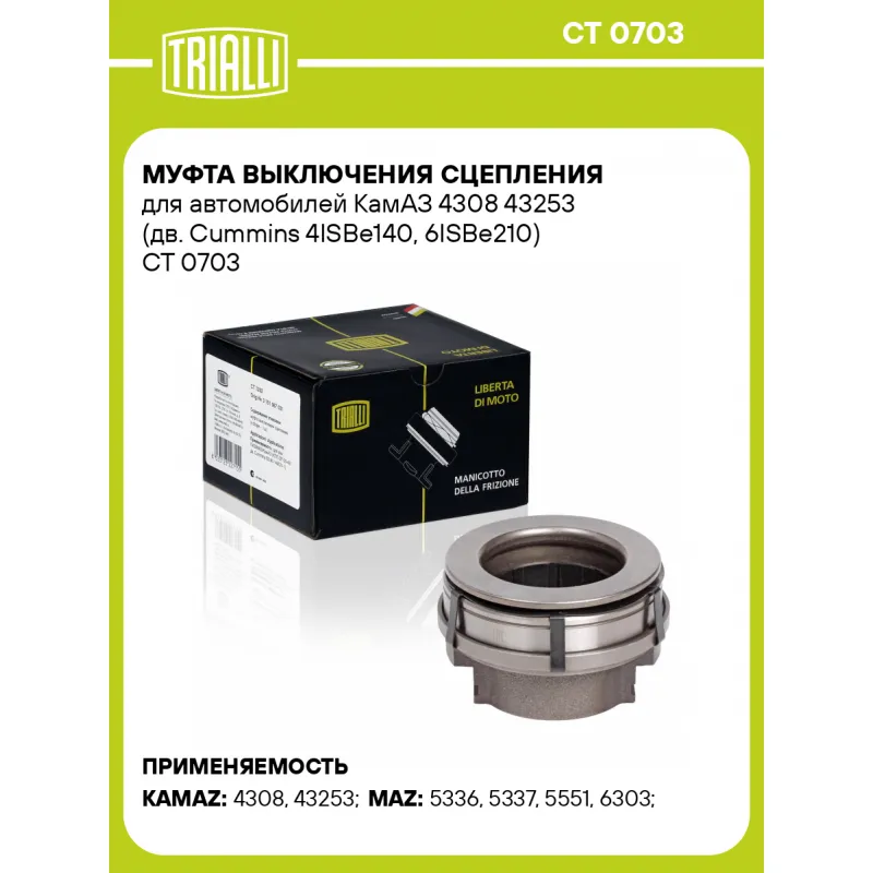 Муфта выключения сцепления для автомобилей КамАЗ 4308 43253 (дв. Cummins 4ISBe140, 6ISBe210) Характеристики: Артикул: CT 0703 OEM номера: 3151000419, 083151000419, 504039135 Тип привода: механический Сопутствующий товар: Муфты сцепления: Комбинированный (алюминий, сталь, пластмасса (полиамид), вулканизированная резина (EPDM, NBR)) Количество на автомобиль: 1 Сопутствующие товары:: комплекты сцеплений Гарантийный срок: 12 месяцев без ограничения по пробегу Товарная линейка: BLACK Подходит для авто: КамаАЗ 4308, 43253 МАЗ 5336, 5337, 5551, 6303 Для проверки применяемости отправьте VIN автомобиля через вкладку "Есть вопросы о товаре?" Комплектация: Муфта выключения сцепления в сборе - 1 шт Гарантия: от 1 года.