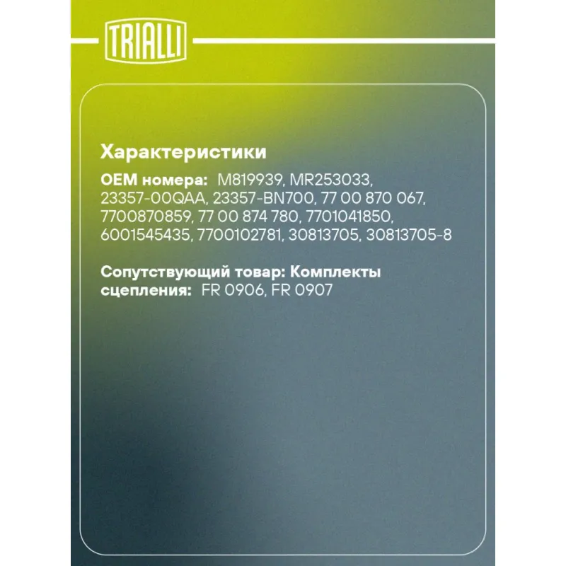 | Сопутствующий товар: Комплекты сцепления | FR 0906, FR 0907 |