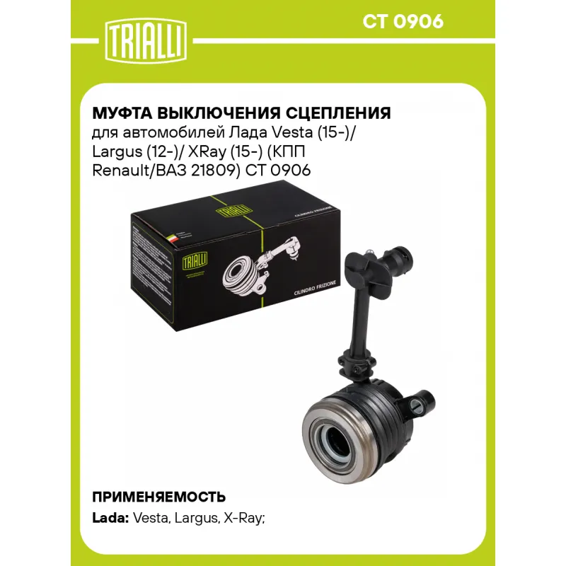 Муфта выключения сцепления для автомобилей Лада Vesta (15-)/ Largus (12-)/ XRay (15-) (КПП Renault/ВАЗ 21809) Характеристики: Артикул: CT 0906 OEM номера: 306201586R, 306205482R, 306206219R, 8450039694 Особенности конструкции:: коннектор d=13,3 Тип привода: гидравлический Гарантийный срок: 1 год/30 000 км Количество на автомобиль: 1 Сопутствующий товар: Комплекты сцепления: FR 771 Товарная линейка: BLACK КПП: Renault Подходит для авто: ВАЗ Vesta (15-), Largus (12-), X-Ray (15-) Для проверки применяемости отправьте VIN автомобиля через вкладку "Есть вопросы о товаре?" Комплектация: Муфта выключения сцепления в сборе (гидравлическая) - 1 шт Гарантия: от 1 года.