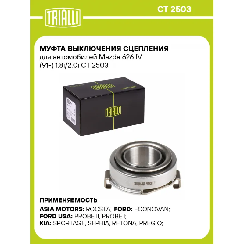 Муфта выключения сцепления для автомобилей Mazda 626 IV (91-) 1.8i/2.0i Характеристики: Артикул: CT 2503 OEM номера: 854016510, 854016510B, FE8416510, G56016510B, H60616510A, N30916510, 0K01116510, 0K247-16-510, 0K43F16510, 0K72A16510, 0K9A2-16-510, 0SE0316510A, 414124Z000, H60616510 Тип привода: механический Гарантийный срок: 1 год/30 000 км Сопутствующий товар: Муфты сцепления: Комбинированный (алюминий, сталь, пластмасса (полиамид), вулканизированная резина (EPDM, NBR)) Количество на автомобиль: 1 Сопутствующие товары:: комплекты сцеплений Товарная линейка: BLACK Комплектация: Муфта выключения сцепления в сборе - 1 шт Гарантия: от 1 года.