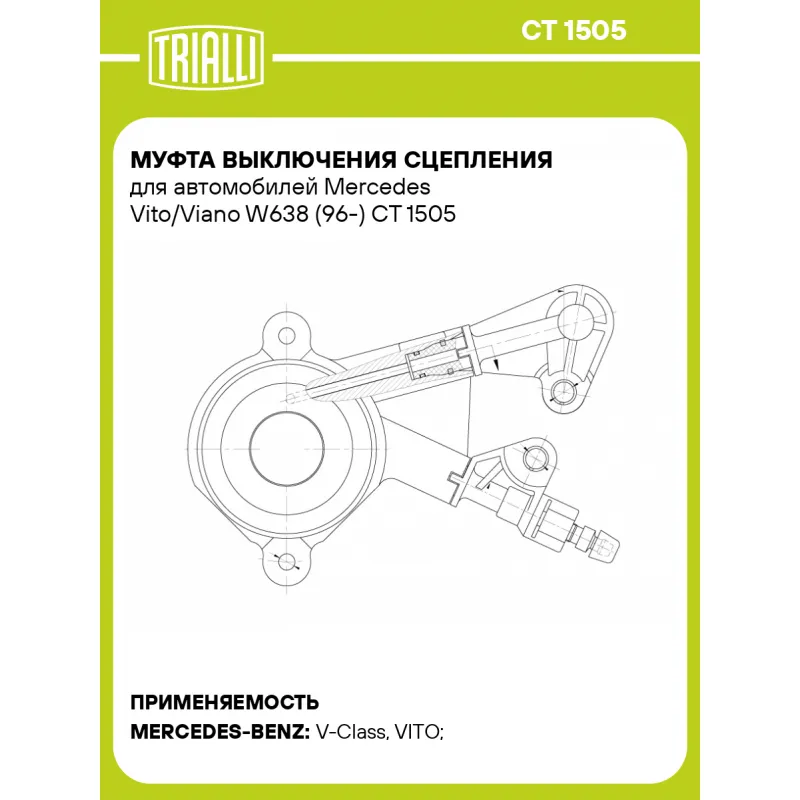 Муфта выключения сцепления для автомобилей Mercedes Vito/Viano W638 (96-) Характеристики: Артикул: CT 1505 OEM номера: 000 254 14 08, 000 254 13 08, A 000 254 14 08, 000 254 18 08, A 000 254 13 08, A 000 254 18 08 Гарантийный срок: 1 год/30 000 км Количество на автомобиль: 1 Сопутствующие товары:: комплекты сцеплений Тип привода... Читать полностью →