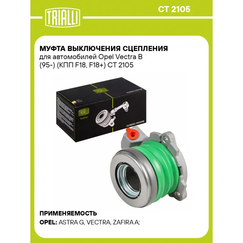 Муфта выключения сцепления для автомобилей Opel Vectra B (95-) (КПП F18, F18+) Характеристики: Артикул: CT 2105 OEM номера: 679346, 90522729 Гарантийный срок: 1 год/30 000 км Количество на автомобиль: 1 Сопутствующие товары:: комплекты сцеплений Тип привода: гидравлический Товарная линейка: BLACK Тип КПП: F18, F18+ Тип двигателя: 16 LZ2, 20 NEJ, C 20 SEL, X 20 XEV, X 17 DT (TC4EE1), X 18 XE, X 20 DTH, Y 20 DTH, X 20 DTL (11.96-.), X 20 XEV Комплектация: Муфта выключения сцепления в сборе (гидравлическая) - 1 шт Гарантия: от 1 года.