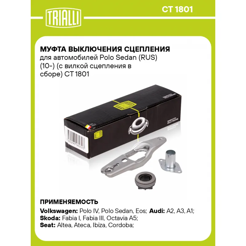 Муфта выключения сцепления для автомобилей Polo Sedan (RUS) (10-) (с вилкой сцепления в сборе) Характеристики: Артикул: CT 1801 OEM номера: 02T 141 153 G, 02T 141 153 F, 02T 141 153 E, 02T 141 153 N, 02T 141 153 P, 02T 141 153 H, 02T 141 153 R, 02T 141 153 Q Тип привода: механический Количество на автомобиль: 1 Сопутствующие товары:: комплекты сцеплений Сопутствующий товар: Комплекты сцепления: FR 1814 Гарантийный срок: 1 год/30 000 км Товарная линейка: BLACK Подходит для авто: Volkswagen Polo IV (01-), Polo Sedan (RUS) (10-), Eos (06-), Golf VI (08-), Golf Plus (05-), Golf Plus (09-), Jetta (05-), Jetta (11-), Beetle (98-), Scirocco (08-), Polo IV (01-), Polo V (09-), Bora (99-), Caddy (04-), Eos (06-), Golf V (03-), Golf VI (08-), Golf VII (12-), Jetta (05-), Passat B6 (05-), Passat B8 (15-), Passat B7 (10-), Touran (03-), Touran III (15-) Audi A2 (99-), A3 (07-), A3 (12-), A1 (10-), A3 (03-) Skoda Fabia I (99-), Fabia III (14-), Octavia A5 (04-), Rapid (12-), Roomster (06-), Superb II (08-), Yeti (09-), Fabia I (99-), Fabia II (07-), Karoq (17-), Octavia A5 (04-), Octavia A7 (13-), Rapid (12-), Roomster (06-), Yeti (09-) Seat Altea (04-), Altea (07-), Ateca (16-), Ibiza (00-), Ibiza (00-), Cordoba (00-), Cordoba (00-), Leon (12-) Для проверки применяемости отправьте VIN автомобиля через вкладку "Есть вопросы о товаре?" Комплектация: Муфта выключения сцепления в сборе - 1 шт Вилка выключения сцепления - 1 шт Втулка направляющая - 1 шт Гарантия: от 1 года.