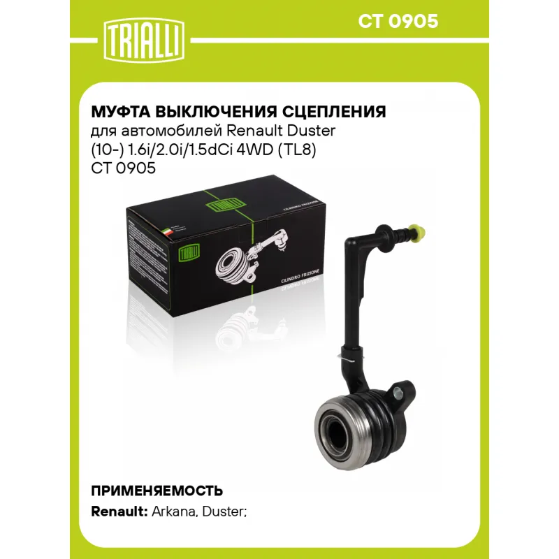 Муфта выключения сцепления для автомобилей Renault Duster (10-) 1.6i/2.0i/1.5dCi 4WD (TL8) Характеристики: Артикул: CT 0905 OEM номера: 8200987124, 306202899R, 306204287R, 30 62 056 26R Гарантийный срок: 1 год/30 000 км Количество на автомобиль: 1 Тип привода: гидравлический Товарная линейка: BLACK Тип КПП: TL8 Подходит для авто: Renault Arkana (19-), Duster (10-) Для проверки применяемости отправьте VIN автомобиля через вкладку "Есть вопросы о товаре?" Комплектация: Муфта выключения сцепления в сборе (гидравлическая) - 1 шт Гарантия: от 1 года.