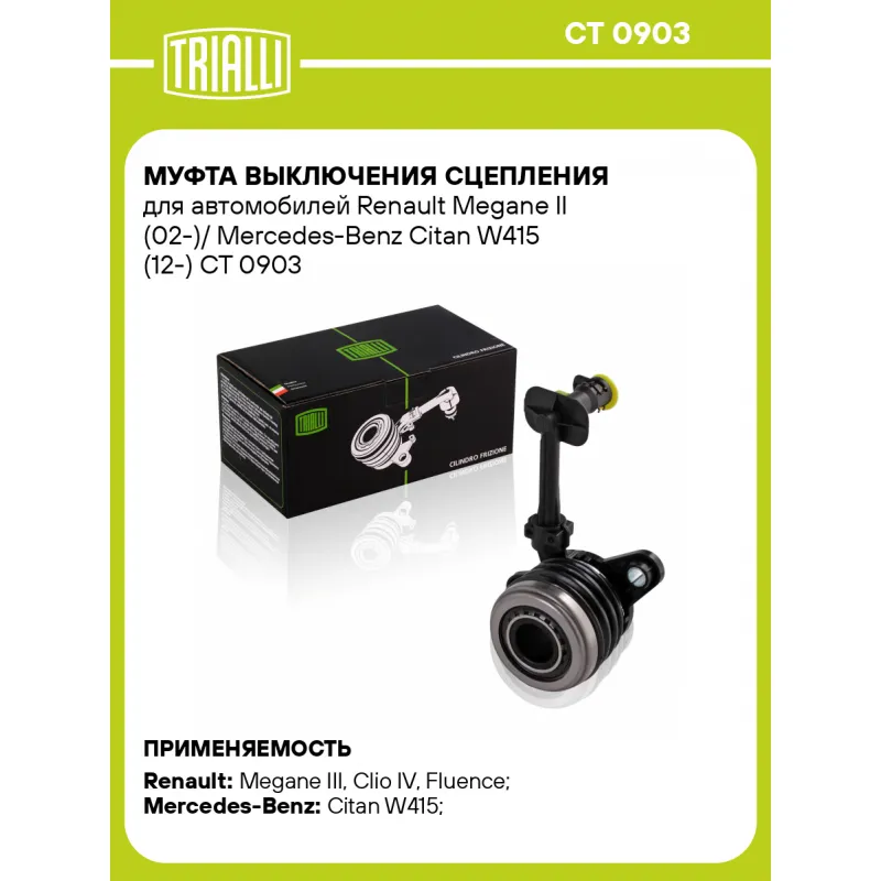 Муфта выключения сцепления для автомобилей Renault Megane II (02-)/ Mercedes-Benz Citan W415 (12-) Характеристики: Артикул: CT 0903 OEM номера: A 415 250 00 15, 415 250 00 15, 415 250 16 00, 415 250 20 00, 415 250 27 00, A 415 250 16 00, A 415 250 20 00, A 415 250 27 00, 30 62 092 22R, 82 00 046 102, 82 00 855 816, 30 62 023 13R, 30 62 027 60R, 30 62 095 36R Особенности конструкции:: коннектор d=12.2 Гарантийный срок: 1 год/30 000 км Количество на автомобиль: 1 Тип привода: гидравлический Сопутствующий товар: Комплекты сцепления: FR 0908 Сопутствующий товар: Муфты сцепления: FR 0908 Товарная линейка: BLACK Тип КПП: Mercedes-Benz: 700.710, 700.720 Подходит для авто: Renault Megane III (08-), Clio IV (12-), Fluence (10-), Scenic II (04-), Megane II (02-), Megane III (08-), Clio III (05-), Clio III (05-), Kangoo II (07-), Modus (02-) Mercedes-Benz Citan W415 (12-) Для проверки применяемости отправьте VIN автомобиля через вкладку "Есть вопросы о товаре?" Комплектация: Муфта выключения сцепления в сборе (гидравлическая) - 1 шт Гарантия: от 1 года.