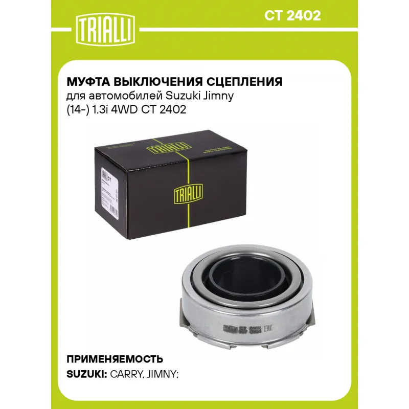 Муфта выключения сцепления для автомобилей Suzuki Jimny (14-) 1.3i 4WD Характеристики: Артикул: CT 2402 OEM номера: 23265-81A20, 23265-81A20-000, 23265-81A40-000, 23265-60K00, 23265-81A40 Тип привода: механический Гарантийный срок: 1 год/30 000 км Количество на автомобиль: 1 Сопутствующие товары:: комплекты сцеплений Товарная ли... Читать полностью →