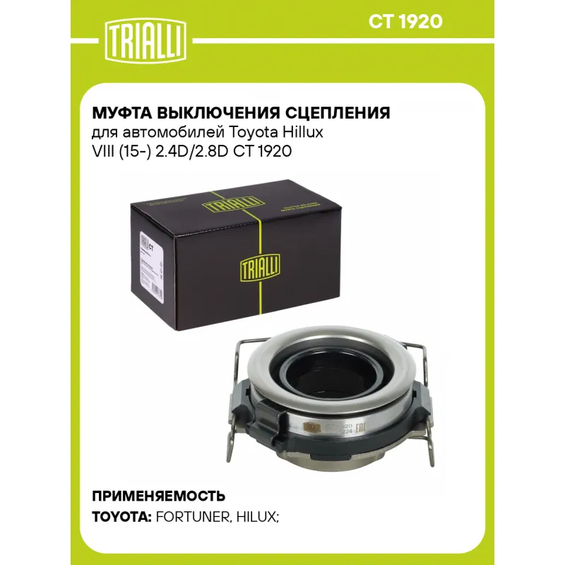 Муфта выключения сцепления для автомобилей Toyota Hillux VIII (15-) 2.4D/2.8D Характеристики: Артикул: CT 1920 OEM номера: 31230-71050, 31230-71051, 31230-71052 Тип привода: механический Гарантийный срок: 1 год/30 000 км Сопутствующий товар: Муфты сцепления: Комбинированный (алюминий, сталь, пластмасса (полиамид), вулканизированная резина (EPDM, NBR)) Количество на автомобиль: 1 Сопутствующие товары:: комплекты сцеплений Товарная линейка: BLACK Комплектация: Муфта выключения сцепления в сборе - 1 шт Гарантия: от 1 года.