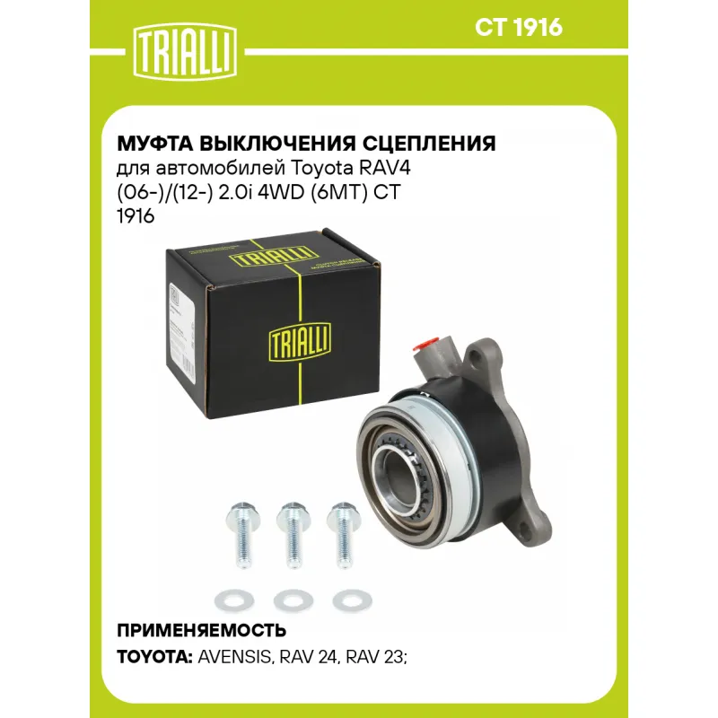 Муфта выключения сцепления для автомобилей Toyota RAV4 (06-)/(12-) 2.0i 4WD (6MT) Характеристики: Артикул: CT 1916 OEM номера: 31400-39006, 31400-52011, 31400-39005 Гарантийный срок: 1 год/30 000 км Сопутствующий товар: Комплекты сцепления: FR 1916, FR 1915 Сопутствующий товар: Ведомые диски сцепления: FD 1916 Сопутствующий това... Читать полностью →