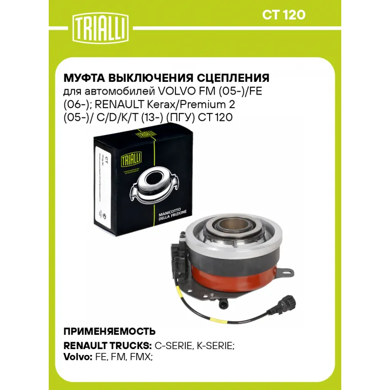 Муфта выключения сцепления для автомобилей VOLVO FM (05-)/FE (06-); RENAULT Kerax/Premium 2 (05-)/ C/D/K/T (13-) (ПГУ) Характеристики: Артикул: CT 120 OEM номера: K-4516CL, 22440568, 21316220, 74 85 003 687, 74 22 429 963, 74 22 809 232, 74 21 320 929, 74 85 020 473, 74 20 812 087, 74 21 580 956, 74 21 580 968, 74 85 013 168, 74 21 465 238, 22440486, 5221580972, 21580956, 22429963, 85002343, 22440437, 23417523, 85003685, 21580968, 21580972, 85026472, 20812087, 85013166, 20806451, 21465240, 21465238, 21320929, 21465235, 21580977, 21320923, 22809232 Особенности конструкции:: с сенсором Тип привода: ПГУ Гарантийный срок: 12 месяцев без ограничения по пробегу Количество на автомобиль: 1 Товарная линейка: BLACK Подходит для авто: RENAULT TRUCKS C-SERIE (13-), K-SERIE (13-), T-SERIE (13-), Kerax (01-), Premium II (05-) Volvo FE (06-), FM (05-), FMX (10-) Для проверки применяемости отправьте VIN автомобиля через вкладку "Есть вопросы о товаре?" Комплектация: Муфта выключения сцепления в сборе (гидравлическая) - 1 шт Гарантия: от 1 года.