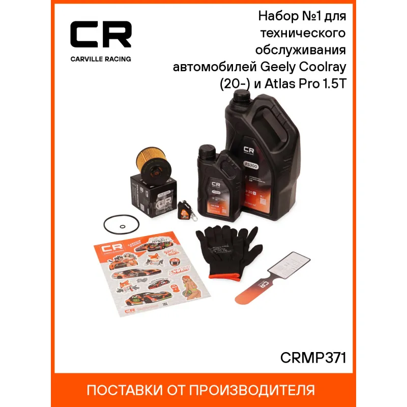 Набор №1 для технического обслуживания автомобилей Geely Coolray (20-) и Atlas Pro (20-) 1.5T Описание: Набор №1 для проведения масляного сервиса автомобилей Geely Coolray (20-) и Atlas Pro (20-), двигатель 1.5T: Состав набора: Масло моторное FS300 0W-20 V C5 VCCRBS0-2AE 1L (L1D00137) - 1шт.; Масло моторное FS300 0W-20 V C5 VCCRBS0-2AE 5L (L1D00537) - 1шт.; Фильтр для а/м Geely Coolray (20-)/Atlas Pro (20-)/Okavango (20-)/Volvo XC40 (18-) 1.5T (масл.картридж) (CRLR55618) - 1шт.; Уплотнительное кольцо сливной пробки 1056020700 - 1шт.; Перчатки ADWG007 - 1 пара Стикерпак CARVILLE RACING Характеристики: Артикул: CRMP371 OEM номера: 1056022300, 1056024400, 1056028700 Гарантийный срок хранения: 5 лет Комплектация: Масло моторное FS300 0W-20 V C5 VCCRBS0-2AE 1L - 1 шт Масло моторное FS300 0W-20 V C5 VCCRBS0-2AE 5L - 1 шт Фильтр для а/м Geely Coolray (20-)/Atlas Pro (20-)/Okavango (20-)/Volvo XC40 (18-) 1.5T (масл.картридж) - 1 шт Уплотнительное кольцо сливной пробки 1056020700 - 1 шт Перчатки - 1 пар Стикерпак CARVILLE RACING - 1 шт Гарантия: от 1 года.