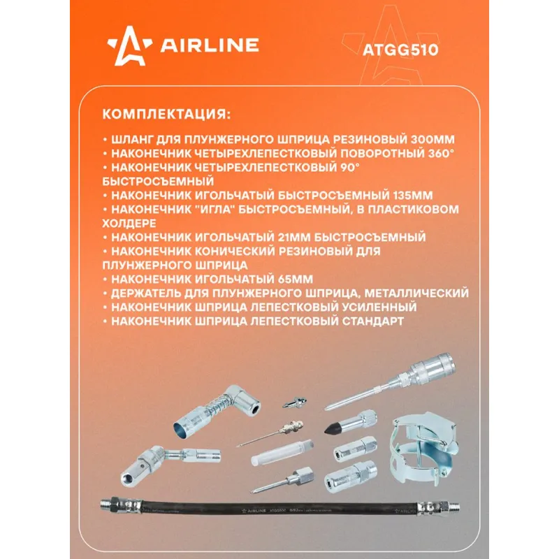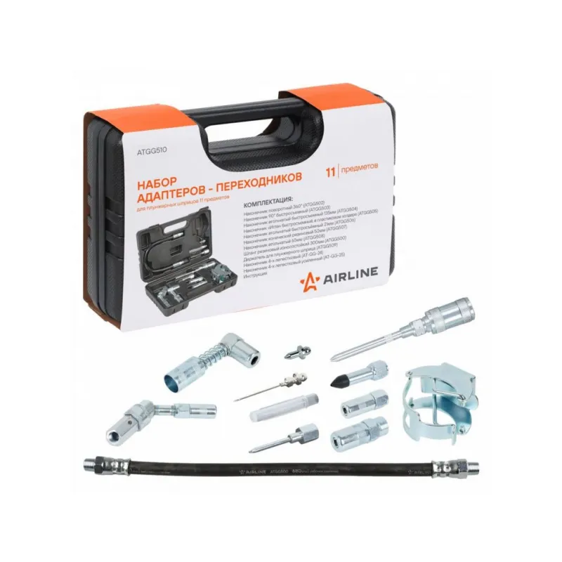 Набор адаптеров-переходников для плунжерных шприцов 11пр., пласт. кейс Описание: Набор ATGG0510 поставляется в пластиковом кейсе. Включает в себя различные виды быстросъемных и навинчивающихся адаптеров-переходников для осуществления смазочных работ в самых труднодоступных местах. Комплектация: Шланг для плунжерного шприца резиновый 300мм (ATGG500)Наконечник четырехлепестковый поворотный 360° (ATGG502)Наконечник четырехлепестковый 90° быстросъемный (ATGG503)Наконечник игольчатый быстросъемный 135мм (ATGG504)Наконечник "Игла" быстросъемный, в пластиковом холдере (ATGG505)Наконечник игольчатый 21мм быстросъемный (ATGG506)Наконечник конический резиновый для плунжерного шприца (ATGG507) Наконечник игольчатый 65мм (ATGG508)Держатель для плунжерного шприца, металлический (ATGG509)Наконечник шприца лепестковый усиленный (AT-GG-25)Наконечник шприца лепестковый стандарт (AT-GG-24) Характеристики: Артикул: ATGG510 Материал: сталь Комплектация: Кейс пластиковый в обечайке - 1 шт Наконечник четырехлепестковый поворотный 360° - 1 шт Наконечник 90° быстросъемный - 1 шт Наконечник игольчатый быстросъемный 135мм - 1 шт Наконечник "Игла" быстросъемный - 1 шт Наконечник игольчатый 21мм быстросъемный - 1 шт Наконечник конический резиновый - 1 шт Наконечник игольчатый 65мм - 1 шт Шланг резиновый износостойкий - 1 шт Держатель для плунжерного шприца - 1 шт Наконечник лепестковый - 1 шт Наконечник лепестковый усиленный - 1 шт Инструкция - 1 шт Гарантия: от 1 года.