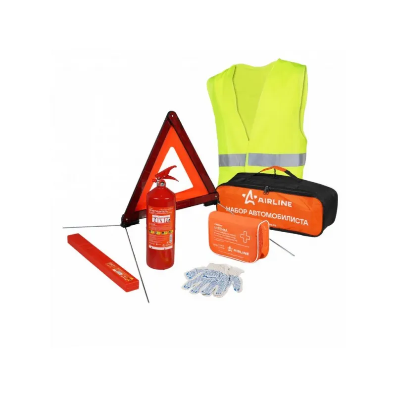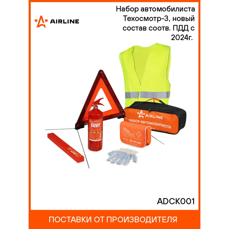 Набор автомобилиста Техосмотр-3, новый состав соотв. ПДД с 2024г.(знак ав.,апт.,огн.,перч.,жилет) Описание: Универсальный комплект изделий "Техосмотра 3" необходим каждому автомобилю для соответствия обновленными правилам управления транспортным средством с 2024 года. Набор от AIRLINE укомплектован "ГОСТовским составом" изделий, требуемых для оперативного разрешения непредвиденных ситуаций в дороге. Для хранения изделий предусмотрена удобная сумка, которая поможет при транспортировке набора в салоне автомобиля. Соответствует всем предъявляемым правилам, требованиям ГАИ, ТР ТС и ГОСТам.Все комплектующие, входящие в состав набора имеют необходимые сертификаты. Характеристики: Артикул: ADCK001 Цвет: оранжевый Ручка: Да Плотность материала, ден: 420-600 Длина, мм: 450 Соответствует требованиям Техосмотра: да Глубина, мм: 120 Высота, мм: 150 Комплектация: Знак аварийной остановки классический (соответствует ТР ТС 018/2011), пласт.кейс - 1 шт Аптечка автомобильная, новый состав МЗ РФ 260н, соотв.треб. ГАИ, текстильный футляр - 1 шт Огнетушитель порошковый ОП2 ABCE - 1 шт Перчатки ХБ с ПВХ покрытием, белые/черные, (1 пара), 42гр., 150Т/7,5 класс - 1 шт Сумка для комплектации набора автомобилиста универсальная (ЭКО, ТО, ТО-2) (45х15х12см), оранжевый/черный - 1 шт Жилет со светоотражающими полосами, взрослый, р. XL (65*65 см), желтый - 1 шт Гарантия: от 1 года.
