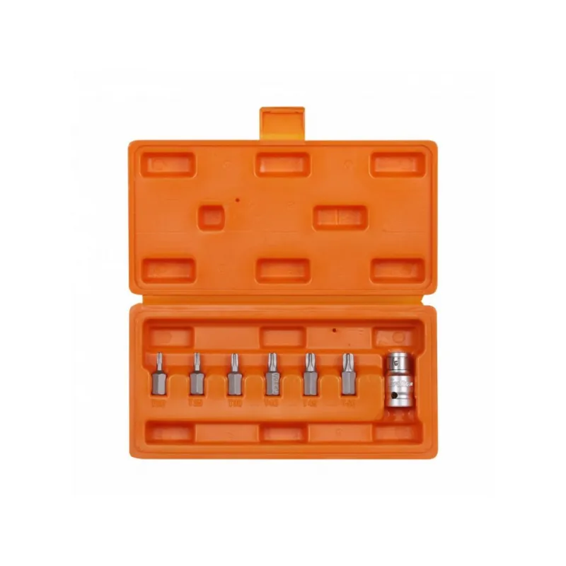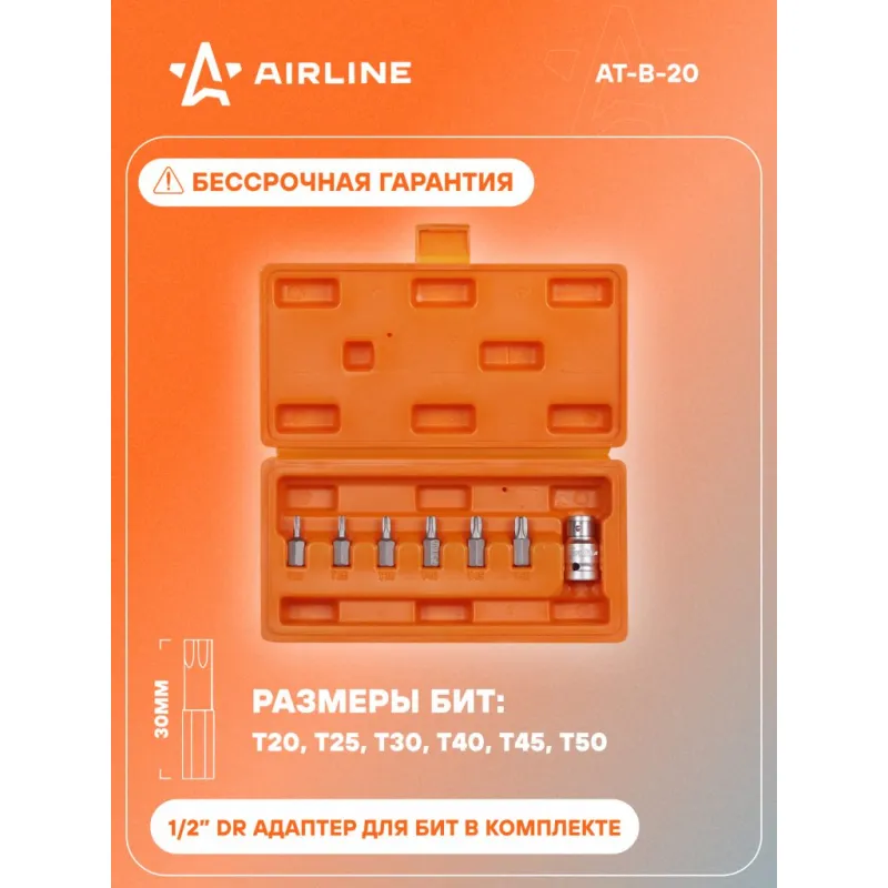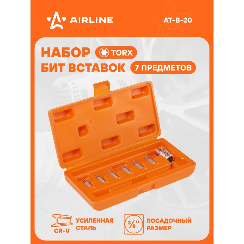 Набор бит вставок TORX 3/8" 30мм с держателем бит 1/2" DR 7 предметов в кейсе Описание: Набор бит вставок TORX 3/8" 30мм с держателем бит 1/2" DR 7 предметов в кейсе AIRLINE AT-B-20 - универсальный набор инструментов для работы с резьбовыми соединениями с различным шлицем. Биты вставки изготовлена из специальной стали CR-V, что придаёт им высокую прочность и долговечность. Размер Биты 30мм: Т20, Т25, Т30, Т40, Т45, Т50 1/2” DR адаптер для бит; Комплектуется 1/2” DR адаптер для бит; В комплекте пластиковый кейс, удобном для хранения и транспортировки; Для шуруповерта, для дрели; Для монтажа, Для сборки, Универсальный; Высокая эффективность при завинчивании или отвинчивании; Разнообразие бит позволит выполнить множество работ в специализированных механических и автосервисах. Набор бит идеально подойдет в набор инструментов идеален для подарка мужу, дедушке, мужчине, автомобилисту, на день рождения, новый год, 23 февраля и без повода. Характеристики: Артикул: AT-B-20 OEM номера: 626187, 40642, S08H2S8S, 951406 Размер: Биты 30мм: Т20, Т25, Т30, Т40, Т45, Т50 1/2” DR адаптер для бит Комплектация: Биты 30мм (по 1 шт.): Т20, Т25, Т30, Т40, Т45, Т50 1/2” DR адаптер для бит Пластиковый кейс Гарантия: от 1 года.