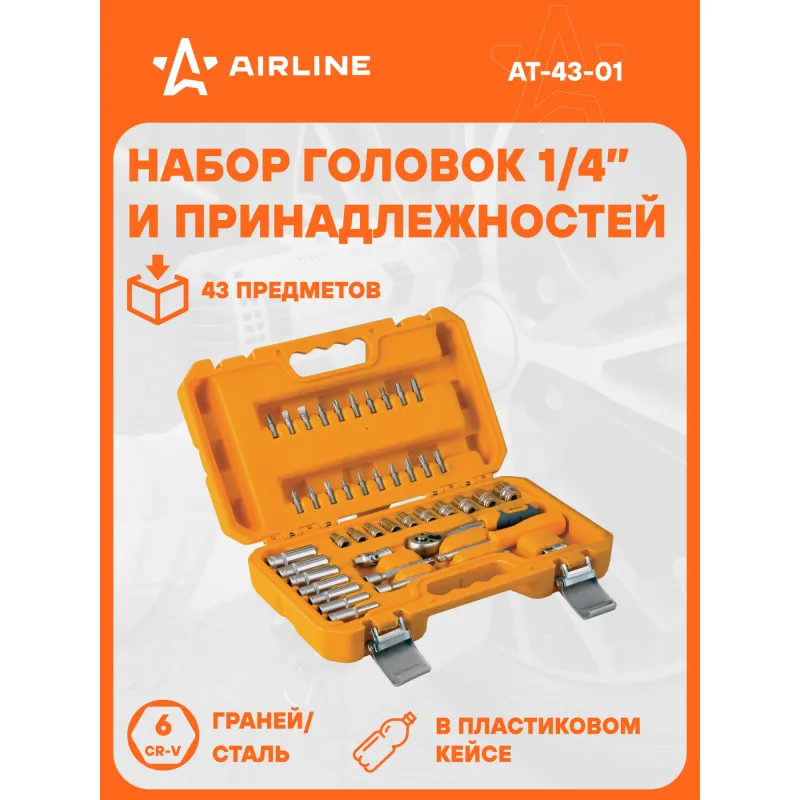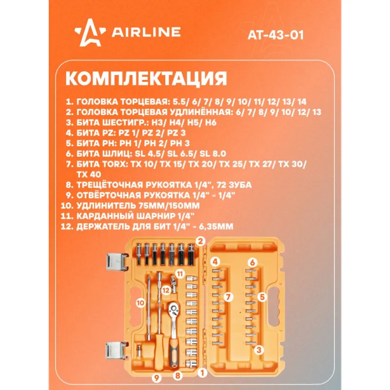 Набор головок и принадлежностей 43пр. (головки 1/4") пласт.кейс Описание: Инструменты соответствуют высоким стандартам качества, поэтому подойдут как для использования на бытовом уровне, так и для применения в профессиональной сфере. Инструменты изготовлены из высококачественной хром-ванадиевой стали. Металлические части изготовлены методом горячей ковки, что придаёт им высокую прочность и долговечность. Финишное прочное хромированное покрытие защищает Инструмент от воздействия коррозии, делает его более износостойким и легко очищается от загрязнений. Продуманный профиль рабочей части торцевых головок смещает пятно контакта с ребра грани на её поверхность, что предотвращает повреждение болтов и гаек даже при самых высоких нагрузках. Эргономичный профиль рукояток приводов и воротков позволяет развивать большее усилие без риска повреждения кистей рук. Надёжный трещоточный механизм на 72 зуба значительно повышает производительность труда и снижает нагрузки на организм. Характеристики: Артикул: AT-43-01 OEM номера: 39946, 610745, S68H2141S, OMT30S Размер: 5.5,6,7,8,9,10,11,12,13,14мм Комплектация: Головка торцевая 6гр. 5.5, 6, 7, 8, 9, 10, 11, 12, 13, 14 Головка торцевая удлинённая 6гр. 6, 7, 8, 9, 10, 12, 13 Бита шестигр. H3, H4, H5, H6 Бита PZ PZ 1, PZ 2, PZ 3 Бита PH PH 1, PH 2, PH 3 Бита шлиц SL 4.5, SL 6.5, SL 8.0 Бита TORX TX 10, TX 15, TX 20, TX 25, TX 27, TX 30, TX 40 Трещёточная рукоятка 1/4", 72 зуба Отвёрточная рукоятка 1/4" - 1/4" Удлинитель 50мм, 150мм Карданный шарнир 1/4" Держатель для бит 1/4" - 6,35мм Гарантия: от 1 года.