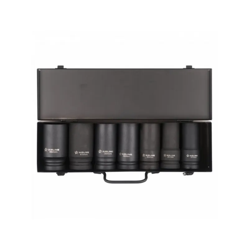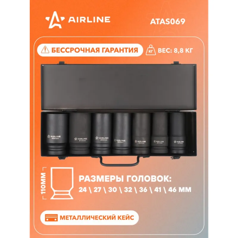 Набор головок ударных 1" 110мм 7 пр. (24-46мм) мет. кейс. Описание: Набор головок ударных шестигранных 1" 110 мм 7 шт (24-46 мм) в кейсе ATAS069 бренда AIRLINE применяется для монтажа/демонтажа крепежных элементов с помощью пневматического гайковерта. Головка рассчитана на использование совместно с пневматическим гайковёртом и усилителем крутящего момента. - Размеры 24,27,30,32,36,41,46мм; - Материал - сталь 42CrMo; - Твердость - 45-49 HRC; - Покрытие - фосфатирование; - Материал обеспечивает стойкость к высоким нагрузкам. - Ударные головки для гайковерта, электроинструмента, пневмогайковерта, ручного инструмента и шуруповерта облегчат выполняемые задач. - В корпусе есть сквозное отверстие под штифт. Применение головки: при сборке и разборке узлов автомобиля, для монтажа и демонтажа колес легковых и грузовых автомобилей, в шиномонтажах, автосервисе. Предназначен для профессионального использования на СТО. Набор головок ударных дополнит набор инструментов для автомобиля который удобно хранить в багажнике машины, гараже, дома, а также легко транспортировать. Ударные головки значительно облегчают ремонт автомобиля и сокращают затраченное время на работу. Профессиональный набор инструментов для автомобиля, дома это отличный вариант для подарка мужчине, мужу, дедушке, автомобилисту, на день рождения, новый год, 23 февраля и без повода. Характеристики: Артикул: ATAS069 Длина, мм: 110 Размер: 24,27,30,32,36,41,46мм Присоединительный квадрат: 1"DR Комплектация: Кейс - 1 шт Головка - 7 шт Гарантия: от 1 года.