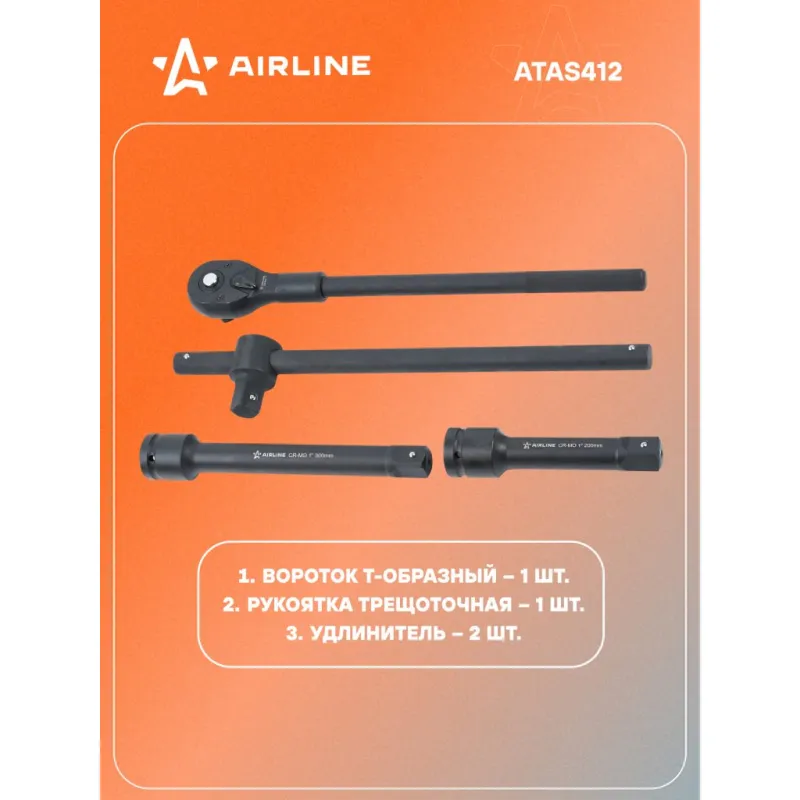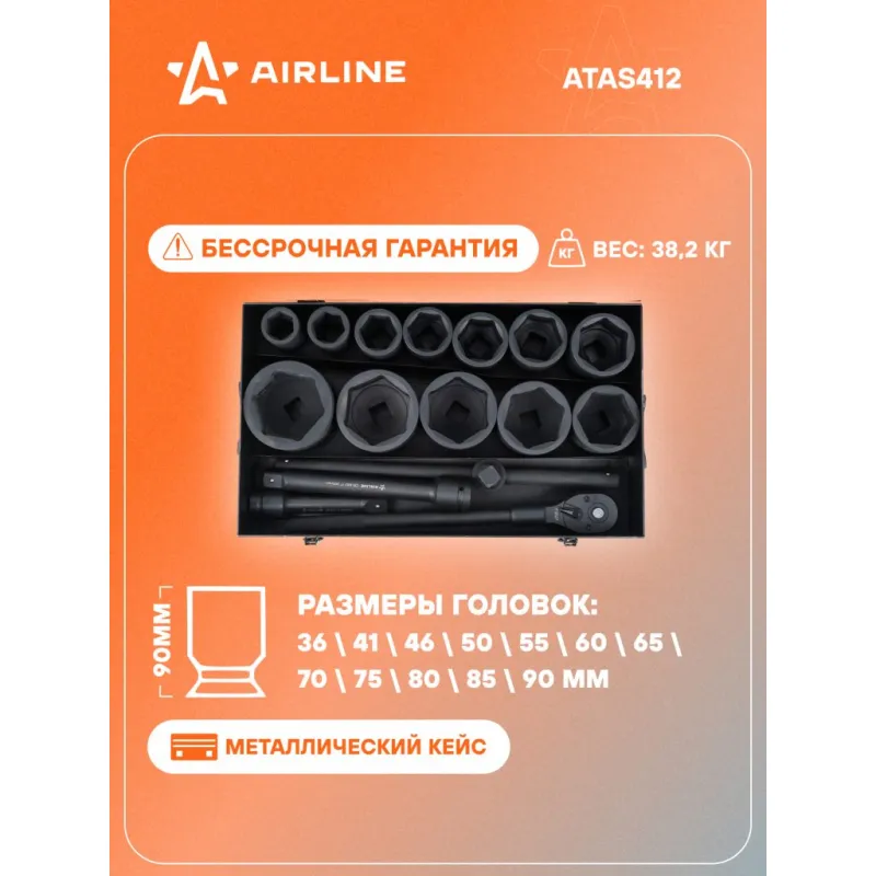 Набор головок ударных 1" 16пр. (36-90мм) металл.кейс Описание: Набор головок ударных шестигранных 1" 90 мм 16 шт (36-90 мм) в кейсе ATAS412 бренда AIRLINE применяется для монтажа/демонтажа крепежных элементов с помощью пневматического гайковерта. Головка рассчитана на использование совместно с пневматическим гайковёртом и усилителем крутящего момента. - Размеры 36,41,46,50,55,60,65,70,75,80,85,90мм; - Материал - сталь 42CrMo; - Твердость - 45-49 HRC; - Покрытие - фосфатирование; - Материал обеспечивает стойкость к высоким нагрузкам. - Ударные головки для гайковерта, электроинструмента, пневмогайковерта, ручного инструмента и шуруповерта облегчат выполняемые задач. - В корпусе есть сквозное отверстие под штифт. Применение головки: при сборке и разборке узлов автомобиля, для монтажа и демонтажа колес легковых и грузовых автомобилей, в шиномонтажах, автосервисе. Предназначен для профессионального использования на СТО. Все инструменты производятся по единой технологии на современных автоматизированных предприятиях. Тестирование происходит в собственной испытательной лаборатории, что является залогом качества и надежности. Набор головок ударных дополнит набор инструментов для автомобиля который удобно хранить в багажнике машины, гараже, дома, а также легко транспортировать. Ударные головки значительно облегчают ремонт автомобиля и сокращают затраченное время на работу. Профессиональный набор инструментов для автомобиля, дома это отличный вариант для подарка мужчине, мужу, дедушке, автомобилисту, на день рождения, новый год, 23 февраля и без повода. Характеристики: Артикул: ATAS412 Размер: 36,41,46,50,55,60,65,70,75,80,85,90мм Длина, мм: 90 Присоединительный квадрат: 1" Длина,мм: 90 Комплектация: Удлинитель - 2 шт Головка - 12 шт Кейс - 1 шт Вороток Т-образный - 1 шт Рукоятка трещоточная - 1 шт Гарантия: от 1 года.