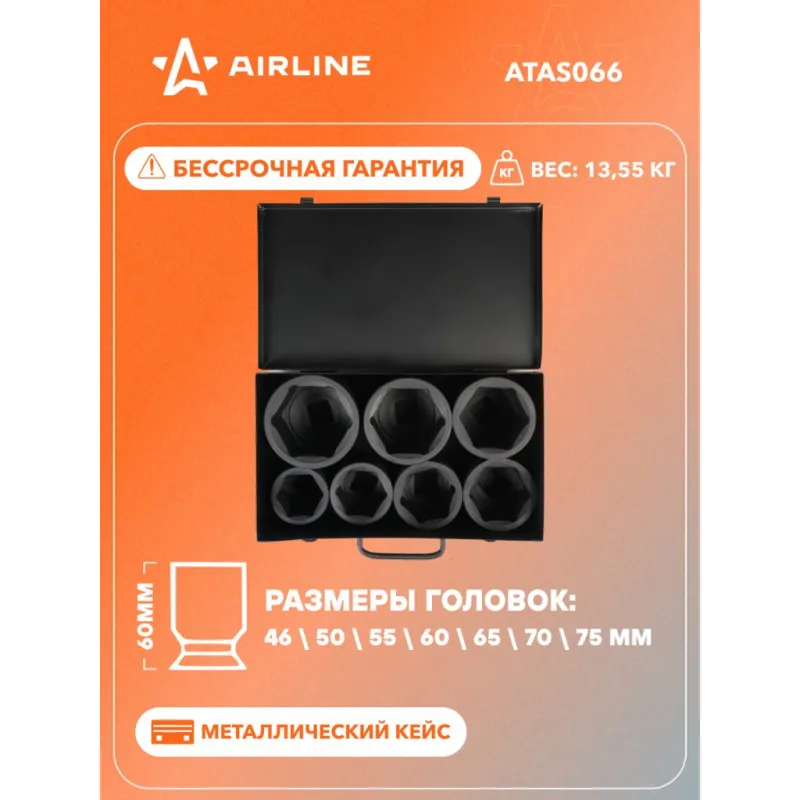 Набор головок ударных 1" 60мм 7 пр. (46-75мм) мет. кейс. Описание: Набор головок ударных шестигранных 1" 7 пр. (46-75мм) в металлическом кейсе ATAS066 бренда AIRLINE применяется для монтажа/демонтажа крепежных элементов с помощью пневматического гайковерта. Головка рассчитана на использование совместно с пневматическим гайковёртом и усилителем крутящего момента. - Размеры ; - Материал - сталь 42CrMo; - Твердость - 45-49 HRC; - Покрытие - фосфатирование; - Материал обеспечивает стойкость к высоким нагрузкам. - Ударные головки для гайковерта, электроинструмента, пневмогайковерта, ручного инструмента и шуруповерта облегчат выполняемые задач. - В корпусе есть сквозное отверстие под штифт. Применение головки: при сборке и разборке узлов автомобиля, для монтажа и демонтажа колес легковых и грузовых автомобилей, в шиномонтажах, автосервисе. Предназначен для профессионального использования на СТО. Набор головок ударных дополнит набор инструментов для автомобиля который удобно хранить в багажнике машины, гараже, дома, а также легко транспортировать. Ударные головки значительно облегчают ремонт автомобиля и сокращают затраченное время на работу. Профессиональный набор инструментов для автомобиля, дома это отличный вариант для подарка мужчине, мужу, дедушке, автомобилисту, на день рождения, новый год, 23 февраля и без повода. Характеристики: Артикул: ATAS066 Комплектация: Головка - 7 шт Кейс - 1 шт Гарантия: от 1 года.