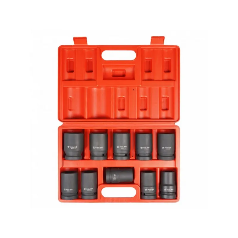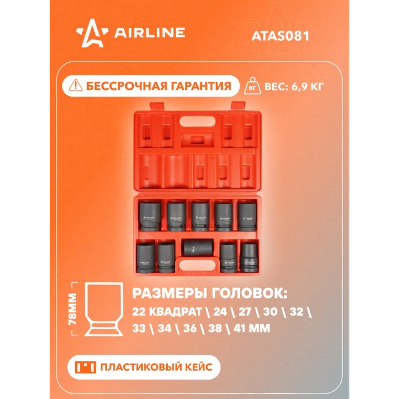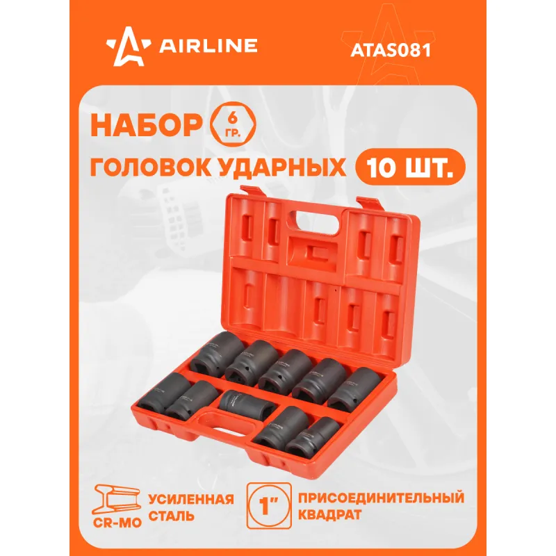 Набор головок ударных 1" 78мм 10 пр. (22квадрат, 24-41мм) пласт. кейс. Описание: Набор головок ударных шестигранных 1" 78 мм 10 шт (22квадрат, 24-41мм) в кейсе ATAS081 бренда AIRLINE применяется для монтажа/демонтажа крепежных элементов с помощью пневматического гайковерта. Головка рассчитана на использование совместно с пневматическим гайковёртом и усилителем крутящего момента. - Размеры 22квадрат,24,27,30,32,33,34,36,38,41мм; - Материал - сталь 42CrMo; - Твердость - 45-49 HRC; - Покрытие - фосфатирование; - Материал обеспечивает стойкость к высоким нагрузкам. - Ударные головки для гайковерта, электроинструмента, пневмогайковерта, ручного инструмента и шуруповерта облегчат выполняемые задач. - В корпусе есть сквозное отверстие под штифт. Применение головки: при сборке и разборке узлов автомобиля, для монтажа и демонтажа колес легковых и грузовых автомобилей, в шиномонтажах, автосервисе. Предназначен для профессионального использования на СТО. Набор головок ударных дополнит набор инструментов для автомобиля который удобно хранить в багажнике машины, гараже, дома, а также легко транспортировать. Ударные головки значительно облегчают ремонт автомобиля и сокращают затраченное время на работу. Профессиональный набор инструментов для автомобиля, дома это отличный вариант для подарка мужчине, мужу, дедушке, автомобилисту, на день рождения, новый год, 23 февраля и без повода. Характеристики: Артикул: ATAS081 Длина, мм: 78 Размер: 22квадрат,24,27,30,32,33,34,36,38,41мм Присоединительный квадрат: 1"DR Комплектация: Головка - 10 шт Кейс - 1 шт Гарантия: от 1 года.