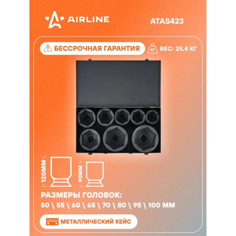 Набор головок ударных 1" 8пр. (50-100мм) металл.кейс Описание: Набор головок ударных шестигранных 1" 90 мм 8 шт (50-100 мм) в кейсе ATAS423 бренда AIRLINE применяется для монтажа/демонтажа крепежных элементов с помощью пневматического гайковерта. Головка рассчитана на использование совместно с пневматическим гайковёртом и усилителем крутящего момента. - Размеры 50,55,60,65,70,80,95,100мм; - Материал - сталь 42CrMo; - Твердость - 45-49 HRC; - Покрытие - фосфатирование; - Материал обеспечивает стойкость к высоким нагрузкам. - Ударные головки для гайковерта, электроинструмента, пневмогайковерта, ручного инструмента и шуруповерта облегчат выполняемые задач. - В корпусе есть сквозное отверстие под штифт. Применение головки: при сборке и разборке узлов автомобиля, для монтажа и демонтажа колес легковых и грузовых автомобилей, в шиномонтажах, автосервисе. Предназначен для профессионального использования на СТО. Все инструменты производятся по единой технологии на современных автоматизированных предприятиях. Тестирование происходит в собственной испытательной лаборатории, что является залогом качества и надежности. Набор головок ударных дополнит набор инструментов для автомобиля который удобно хранить в багажнике машины, гараже, дома, а также легко транспортировать. Ударные головки значительно облегчают ремонт автомобиля и сокращают затраченное время на работу. Профессиональный набор инструментов для автомобиля, дома это отличный вариант для подарка мужчине, мужу, дедушке, автомобилисту, на день рождения, новый год, 23 февраля и без повода. Характеристики: Артикул: ATAS423 Размер: 50,55,60,65,70,80,95,100мм Длина, мм: 90 Присоединительный квадрат: 1" Длина,мм: 90-120 Комплектация: Головка - 8 шт Кейс - 1 шт Гарантия: от 1 года.