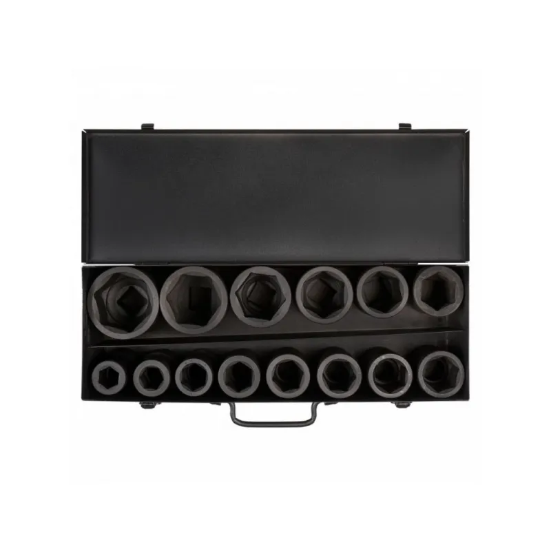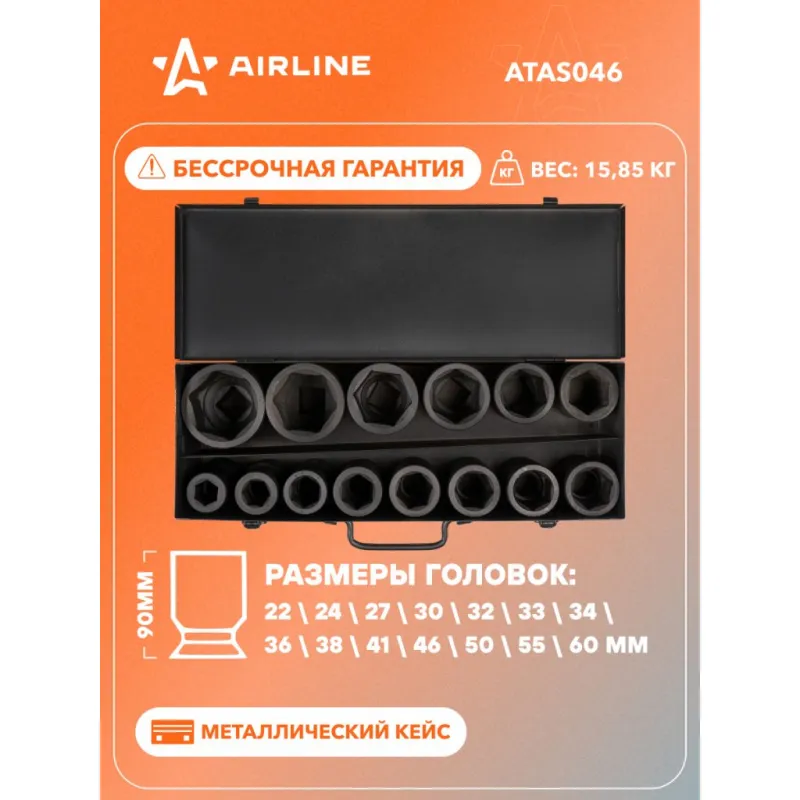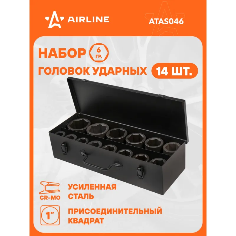 Набор головок ударных 1" 90мм 14пр. (22-60мм) мет. кейс Описание: Набор головок ударных шестигранных 1" 90 мм 14 шт (22-60 мм) в металлическом кейсе ATAS046 бренда AIRLINE применяется для монтажа/демонтажа крепежных элементов с помощью пневматического гайковерта. Головка рассчитана на использование совместно с пневматическим гайковёртом и усилителем крутящего момента. - Размеры 22,24,27,30,32,33,34,36,38,41,46,50,55,60мм; - Материал - сталь 42CrMo; - Твердость - 45-49 HRC; - Покрытие - фосфатирование; - Материал обеспечивает стойкость к высоким нагрузкам. - Ударные головки для гайковерта, электроинструмента, пневмогайковерта, ручного инструмента и шуруповерта облегчат выполняемые задач. - В корпусе есть сквозное отверстие под штифт. Применение головки: при сборке и разборке узлов автомобиля, для монтажа и демонтажа колес легковых и грузовых автомобилей, в шиномонтажах, автосервисе. Предназначен для профессионального использования на СТО. Набор головок ударных дополнит набор инструментов для автомобиля который удобно хранить в багажнике машины, гараже, дома, а также легко транспортировать. Ударные головки значительно облегчают ремонт автомобиля и сокращают затраченное время на работу. Профессиональный набор инструментов для автомобиля, дома это отличный вариант для подарка мужчине, мужу, дедушке, автомобилисту, на день рождения, новый год, 23 февраля и без повода. Характеристики: Артикул: ATAS046 Длина, мм: 90 Размер: 22,24,27,30,32,33,34,36,38,41,46,50,55,60мм Присоединительный квадрат: 1"DR Комплектация: Головка торцевая - 14 шт Кейс - 1 шт Гарантия: от 1 года.