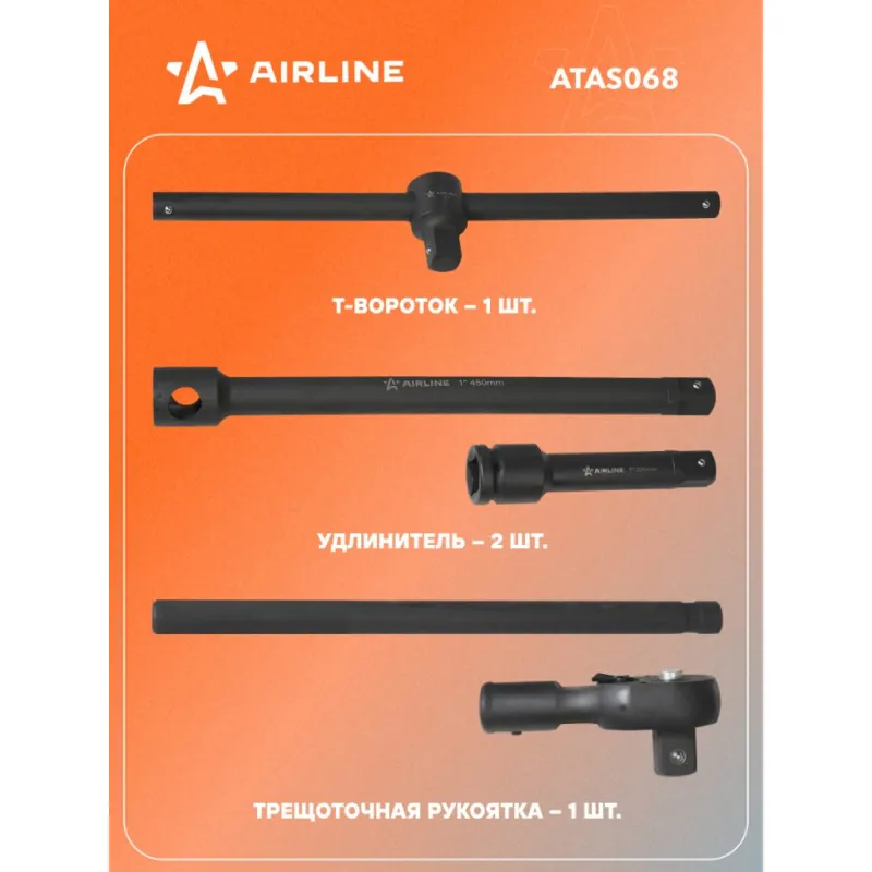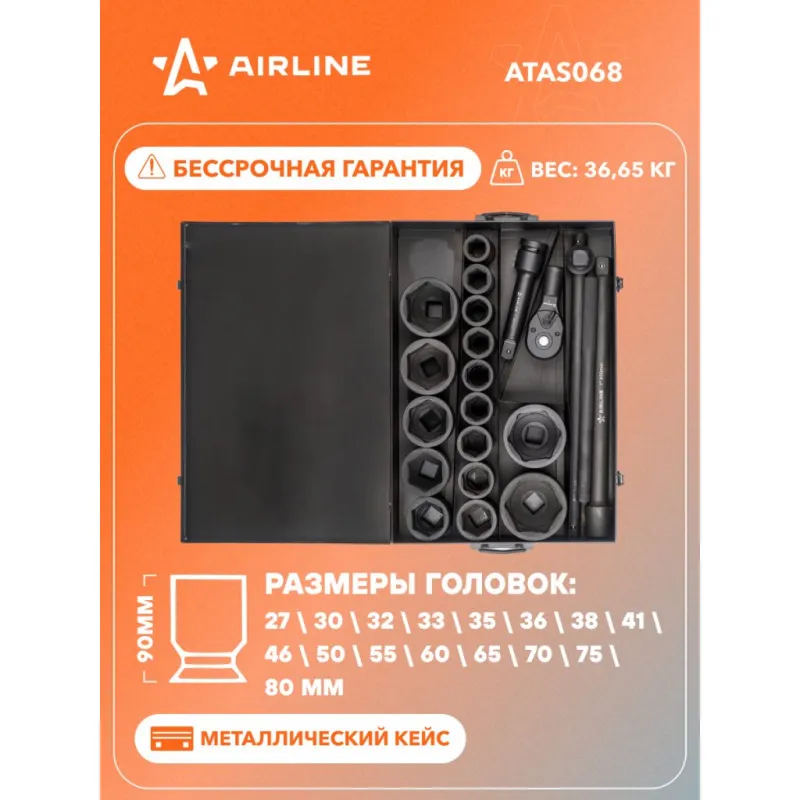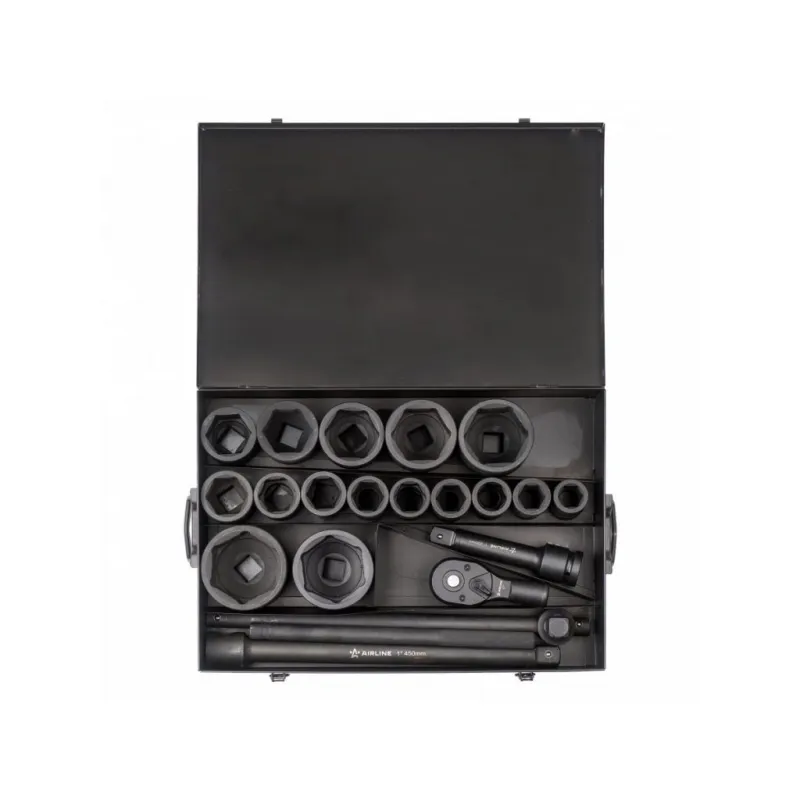 Набор головок ударных 1" 90мм 20 пр. (27-80мм, Т-вороток, трещотка, удлинитель) мет. кейс. Описание: Набор головок ударных шестигранных 1" 90 мм 20 шт (27-80мм, Т-вороток, трещотка, удлинитель) в кейсе ATAS068 бренда AIRLINE применяется для монтажа/демонтажа крепежных элементов с помощью пневматического гайковерта. Головка рассчитана на использование совместно с пневматическим гайковёртом и усилителем крутящего момента. - Размеры 27,30,32,33,35,36,38,41,46,50,55,60,65,70,75,80мм; - Материал - сталь 42CrMo; - Твердость - 45-49 HRC; - Покрытие - фосфатирование; - Материал обеспечивает стойкость к высоким нагрузкам. - Ударные головки для гайковерта, электроинструмента, пневмогайковерта, ручного инструмента и шуруповерта облегчат выполняемые задач. - В корпусе есть сквозное отверстие под штифт. Применение головки: при сборке и разборке узлов автомобиля, для монтажа и демонтажа колес легковых и грузовых автомобилей, в шиномонтажах, автосервисе. Предназначен для профессионального использования на СТО. Набор головок ударных дополнит набор инструментов для автомобиля который удобно хранить в багажнике машины, гараже, дома, а также легко транспортировать. Ударные головки значительно облегчают ремонт автомобиля и сокращают затраченное время на работу. Профессиональный набор инструментов для автомобиля, дома это отличный вариант для подарка мужчине, мужу, дедушке, автомобилисту, на день рождения, новый год, 23 февраля и без повода. Характеристики: Артикул: ATAS068 Длина, мм: 90 Размер: 27,30,32,33,35,36,38,41,46,50,55,60,65,70,75,80мм Присоединительный квадрат: 1"DR Комплектация: Головка - 16 шт Удлинитель - 2 шт Т-вороток - 1 шт Кейс - 1 шт Трещотка - 1 шт Гарантия: от 1 года.