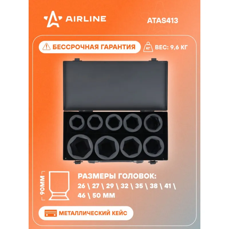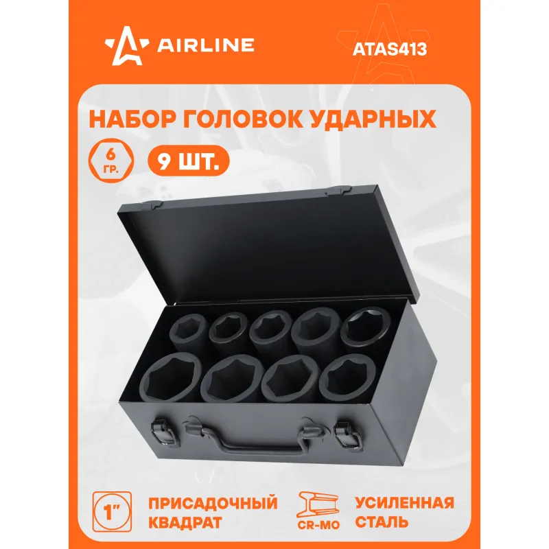Набор головок ударных 1" 9пр. (26-50мм) металл.кейс Описание: Набор головок ударных шестигранных 1" 90 мм 9 шт (26-50 мм) в кейсе ATAS413 бренда AIRLINE применяется для монтажа/демонтажа крепежных элементов с помощью пневматического гайковерта. Головка рассчитана на использование совместно с пневматическим гайковёртом и усилителем крутящего момента. - Размеры 26,27,29,32,35,38,41,46,50мм; - Материал - сталь 42CrMo; - Твердость - 45-49 HRC; - Покрытие - фосфатирование; - Материал обеспечивает стойкость к высоким нагрузкам. - Ударные головки для гайковерта, электроинструмента, пневмогайковерта, ручного инструмента и шуруповерта облегчат выполняемые задач. - В корпусе есть сквозное отверстие под штифт. Применение головки: при сборке и разборке узлов автомобиля, для монтажа и демонтажа колес легковых и грузовых автомобилей, в шиномонтажах, автосервисе. Предназначен для профессионального использования на СТО. Все инструменты производятся по единой технологии на современных автоматизированных предприятиях. Тестирование происходит в собственной испытательной лаборатории, что является залогом качества и надежности. Набор головок ударных дополнит набор инструментов для автомобиля который удобно хранить в багажнике машины, гараже, дома, а также легко транспортировать. Ударные головки значительно облегчают ремонт автомобиля и сокращают затраченное время на работу. Профессиональный набор инструментов для автомобиля, дома это отличный вариант для подарка мужчине, мужу, дедушке, автомобилисту, на день рождения, новый год, 23 февраля и без повода. Характеристики: Артикул: ATAS413 Размер: 26,27,29,32,35,38,41,46,50мм Длина, мм: 90 Присоединительный квадрат: 1" Длина,мм: 90 Комплектация: Кейс - 1 шт Головка - 9 шт Гарантия: от 1 года.
