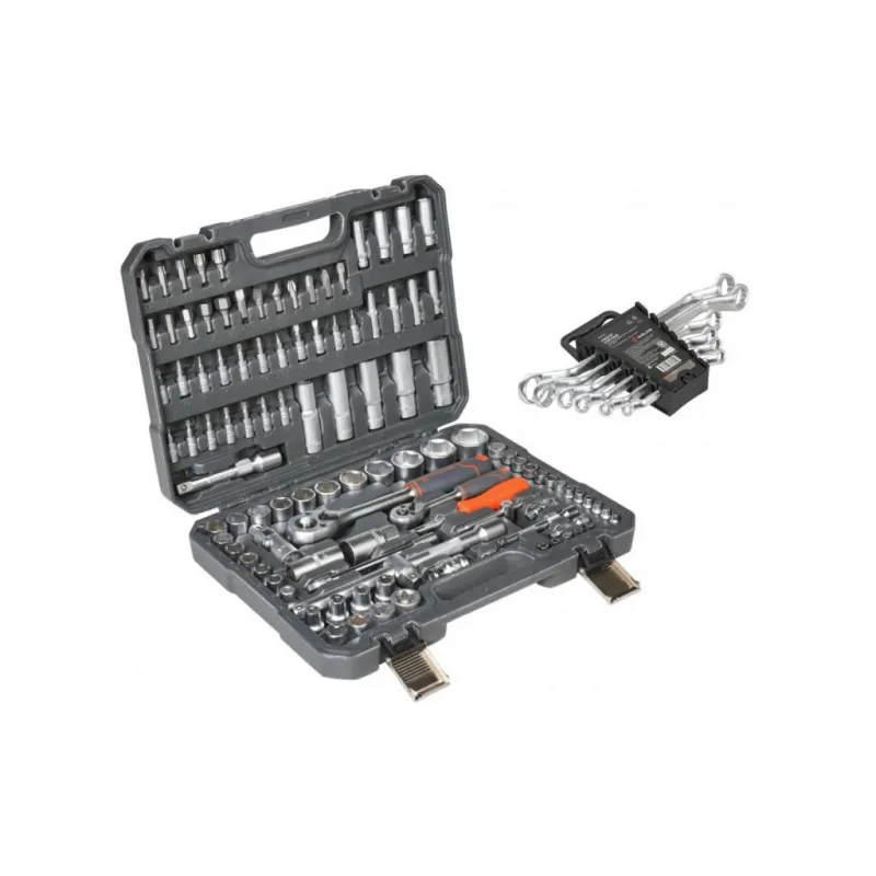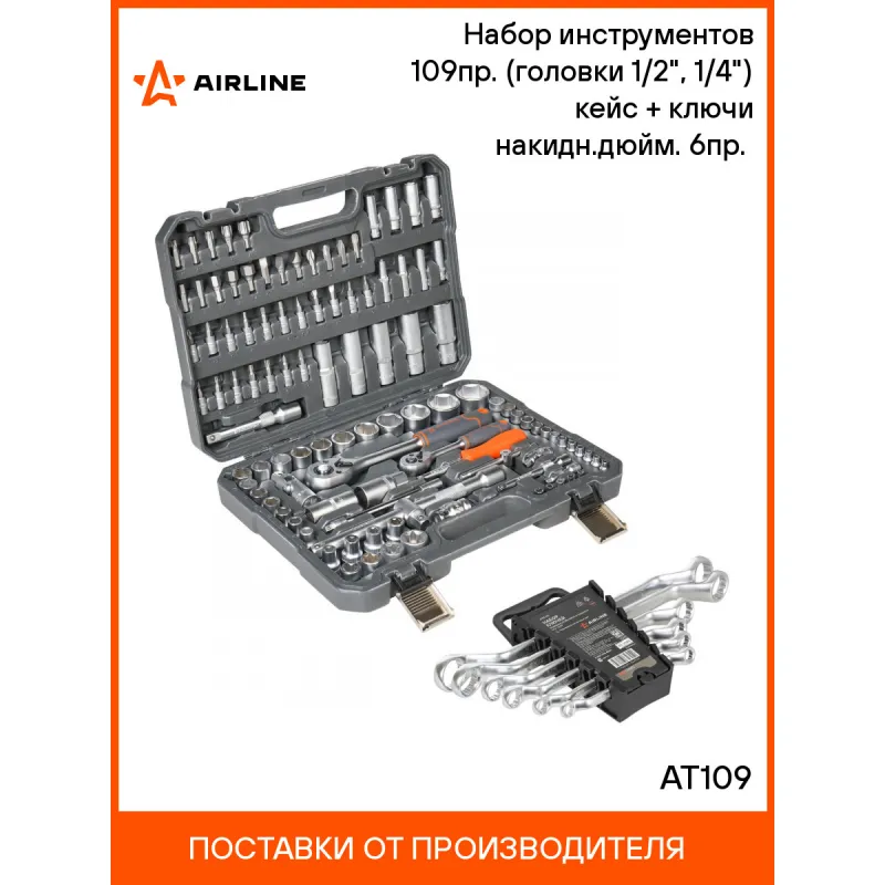 Набор инструментов 109пр. (головки 1/2", 1/4") кейс + ключи накидн.дюйм. 6пр. (5/16"-15/16") Описание: Автомобильный набор инструментов от бренда AIRLINE разработан с учетом ваших потребностей, чтобы сделать процесс ремонта и обслуживания автомобиля максимально удобным и эффективным. Инструменты соответствуют самым высоким стандартам качества и могут быть использованы как в профессиональной сфере, так и в быту. Преимущества: • Многофункциональность: наш универсальный набор инструментов позволит вам решать широкий спектр задач — от замены шин до регулировки узлов и агрегатов. • Высокое качество: Инструменты изготовлены из высококачественной хромованадиевой и высокоуглеродистой стали. Металлические части изготовлены методом горячей ковки, что придаёт им высокую прочность и долговечность. • Финишное прочное хромированное покрытие защищает от воздействия коррозии, делает его более износостойким и легко очищается от загрязнений. • Удобство использования: компактен и легко помещается в багажнике, не занимая много места. • Кейс для хранения дома, в гараже или для транспортировки. Вы всегда сможете взять его с собой в дорогу. • Эргономичный профиль рукояток приводов и воротков. Надёжный трещоточный механизм на 72 зуба значительно повышает производительность труда и снижает нагрузки на организм. Продуманный профиль рабочей части торцевых головок смещает пятно контакта с ребра грани на её поверхность, что предотвращает повреждение болтов и гаек даже при самых высоких нагрузках. Материал: CrV50BV30, S2, для рукояток — бензо- и маслостойкий пластик и резина. Наш набор инструментов подходит для обслуживания и ремонта автомобилей, лёгких грузовиков, фургонов, мотоциклов, квадроциклов, внедорожников и некоторых видов спецтехники. Практичный и полезный подарок для каждого обладателя автомобиля. Наслаждайтесь комфортом и безопасностью на дороге! Характеристики: Артикул: AT109 Размер: AT-109-08 Состав 1/4" Головка торцевая 6гр. 4, 4.5, 5, 5.5, 6, 7, 8, 9, 10, 11, 12, 13, 14 Головка торцевая удлиненная 6гр. 6, 7, 8, 9, 10, 11, 12, 13 Трещёточная рукоятка 1/4", 72 зуба Вороток Т-образный 1/4" Отвёрточная рукоятка 1/4" - 1/4" Удлинитель 50мм, 100мм Головка торцевая TORX E4, E5, E6, E7, E8 Карданный шарнир 1/4" Удлинитель гибкий 145мм Г-образный шестигранный ключ 1.5мм, 2мм, 2.5мм Биты в держателе 1/4" TX8, TX 10, TX 15, TX 20, TX 25, TX 27, TX 30, H3, H4, H5, H6, SL 4, SL 5.5, SL 6.5, PH 1, PH 2, PZ 1, PZ 2 1/2" Биты 8мм H7, H8, H10, H12, H14, SL 8, SL 10, SL 12, PH 3, PH 4, PZ 3, PZ 4, TX 40, TX 45, TX 50, TX 55, TX 60 Головка торцевая 6гр. 8, 10, 11, 12, 13, 14, 15, 16, 17, 18, 19, 21, 22, 24, 27, 30, 32 Головка торцевая удлиненная 6гр. 14, 15, 17, 19, 22 Головка свечная 16мм, 21мм Трещёточная рукоятка 1/2", 72 зуба Держатель для бит 1/2" - 8мм Удлинитель 125мм, 250мм Адаптор для Т-образного воротка 1/2" Карданный шарнир 1/2" Головка торцевая TORX E10, E11, E12, E14, E16, E18, E20, E24 Комплектация: 1/4" Головка торцевая 6гр. 4, 4.5, 5, 5.5, 6, 7, 8, 9, 10, 11, 12, 13, 14 Головка торцевая удлиненная 6гр. 6, 7, 8, 9, 10, 11, 12, 13 Трещоточная рукоятка 1/4", 72 зуба Вороток Т-образный 1/4" Отвёрточная рукоятка 1/4" - 1/4" Удлинитель 50мм, 100мм Головка торцевая TORX E4, E5, E6, E7, E8 Карданный шарнир 1/4" Удлинитель гибкий 145мм Г-образный шестигранный ключ 1.5мм, 2мм, 2.5мм Биты в держателе 1/4" TX8, TX 10, TX 15, TX 20, TX 25, TX 27, TX 30, H3, H4, H5, H6, SL 4, SL 5.5, SL 6.5, PH 1, PH 2, PZ 1, PZ 2 1/2" Биты 8мм H7, H8, H10, H12, H14, SL 8, SL 10, SL 12, PH 3, PH 4, PZ 3, PZ 4, TX 40, TX 45, TX 50, TX 55, TX 60 Головка торцевая 6гр. 8, 10, 11, 12, 13, 14, 15, 16, 17, 18, 19, 21, 22, 24, 27, 30, 32 Головка торцевая удлиненная 6гр. 14, 15, 17, 19, 22 Головка свечная 16мм, 21мм Трещоточная р