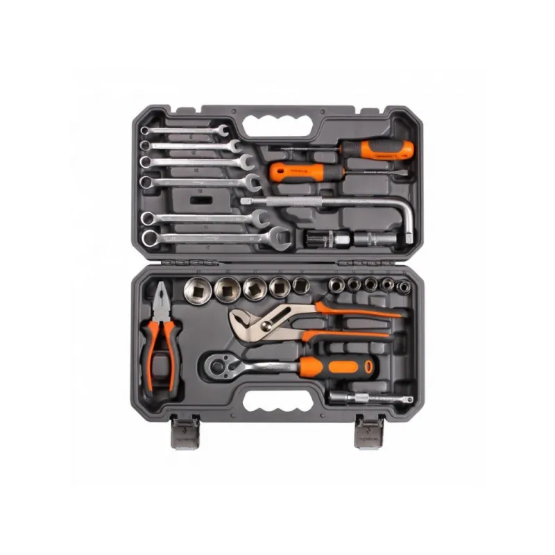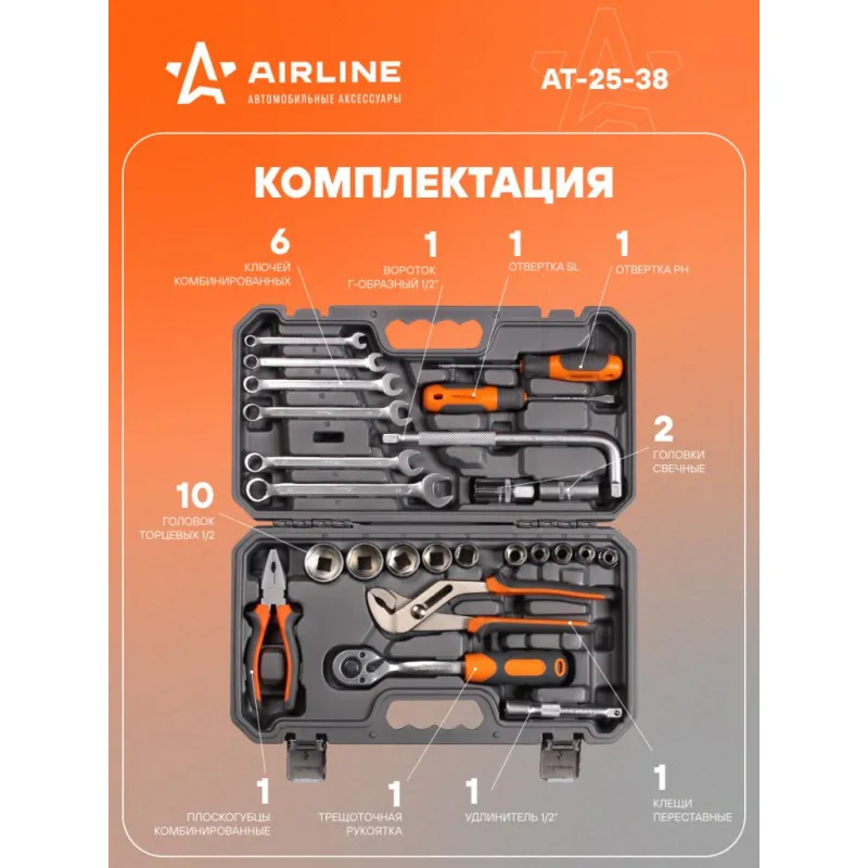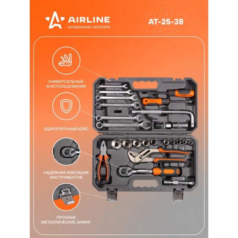Набор инструментов универсальный 25пр. (головки 1/2") кейс Описание: Инструменты соответствуют высоким стандартам качества, поэтому подойдут как для использования на бытовом уровне, так и для применения в профессиональной сфере. Инструменты изготовлены из высококачественной хром-ванадиевой стали. Металлические части изготовлены методом горячей ковки, что придаёт им высокую прочность и долговечность. Финишное прочное хромированное покрытие защищает Инструмент от воздействия коррозии, делает его более износостойким и легко очищается от загрязнений. Финишная обработка двух типов (частичная полировка) головок придаёт им отличный внешний вид. Продуманный профиль рабочей части торцевых головок смещает пятно контакта с ребра грани на её поверхность, что предотвращает повреждение болтов и гаек даже при самых высоких нагрузках. Эргономичный профиль рукояток приводов и воротков позволяет развивать большее усилие без риска повреждения кистей рук. Надёжный трещоточный механизм на 72 зуба значительно повышает производительность труда и снижает нагрузки на организм. Материал: cталь CrV50BV30 Твёрдость: 45-48 HRC Покрытие: Матовое хромирование с частичной полировкой Характеристики: Артикул: AT-25-38 OEM номера: 39848 Размер: Головка торцевая 1/2”DR 6гр. 10, 12, 13, 14, 17, 19, 24, 27, 30, 32 мм Ключ комбинированный 8,10, 12, 13, 14, 17 мм Головка свечная 16мм, 21мм Отвертка SL 6.5*100мм Отвертка PH PH2*100м Удлинитель 1/2"DR 125мм Плоскогубцы комбинированные 160мм Клещи переставные 10”(250мм) Трещоточная рукоятка 1/2"DR, 72 зуба Вороток Г-образный 1/2"DR 250мм Комплектация: Головка торцевая 1/2”DR 6гр. 10, 12, 13, 14, 17, 19, 24, 27, 30, 32 мм Ключ комбинированный 8,10, 12, 13, 14, 17 мм Головка свечная 16мм, 21мм Отвертка SL 6.5*100мм Отвертка PH PH2*100м Удлинитель 1/2"DR 125мм Плоскогубцы комбинированные 160мм Клещи переставные 10”(250мм) Трещоточная рукоятка 1/2"DR, 72 зуба Вороток Г-образный 1/2"DR 250мм Гарантия: от 1 года.