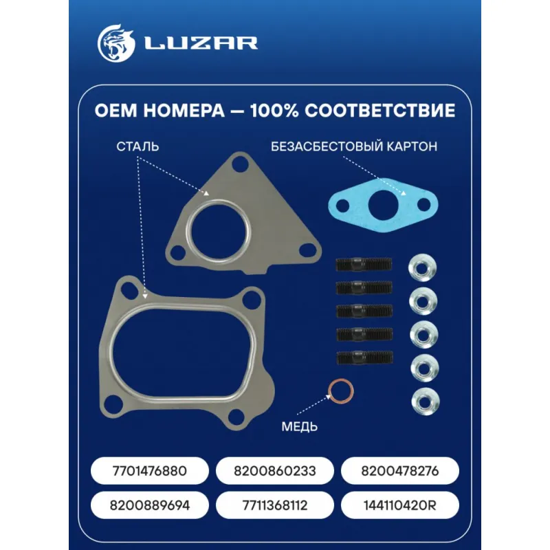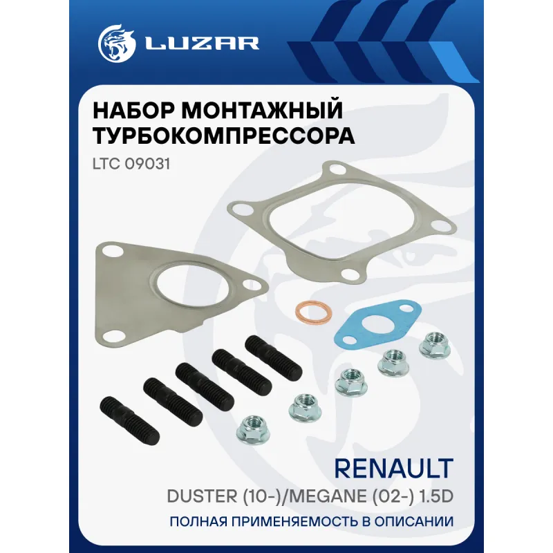 Набор монтажн. турбокомпр. для а/м Renault Duster (10-)/Megane (02-) 1.5d (K9K) (тип KP35) (прокл. 4 шт, шпил. 5 шт., гайк.5 шт.) Характеристики: Артикул: LTC 09031 OEM номера: 7701476880, 8200860233, 8200478276, 8200889694, 7711368112, 144110420R Количество на автомобиль: 1 Материал: Сталь, медь, безасбестовый картон Сопутствующий товар: Турбокомпрессор: LAT 0903 Сопутствующий товар: Актуатор: LTC 0903 Подходит для авто: Renault Duster (10-), Megane II (02-), Megane III (08-), Scenic II (04-), Scenic III (09-) Для проверки применяемости отправьте VIN автомобиля через вкладку "Есть вопросы о товаре?" Комплектация: Прокладка медная - 1 шт Прокладка картонная безасбестовая - 1 шт Прокладка стальная - 2 шт Шпильки - 5 шт Гайки - 5 шт Гарантия: от 1 года.