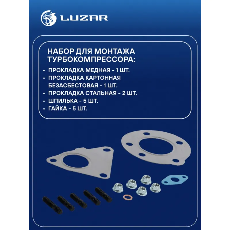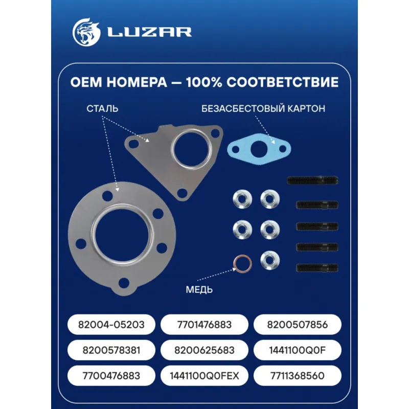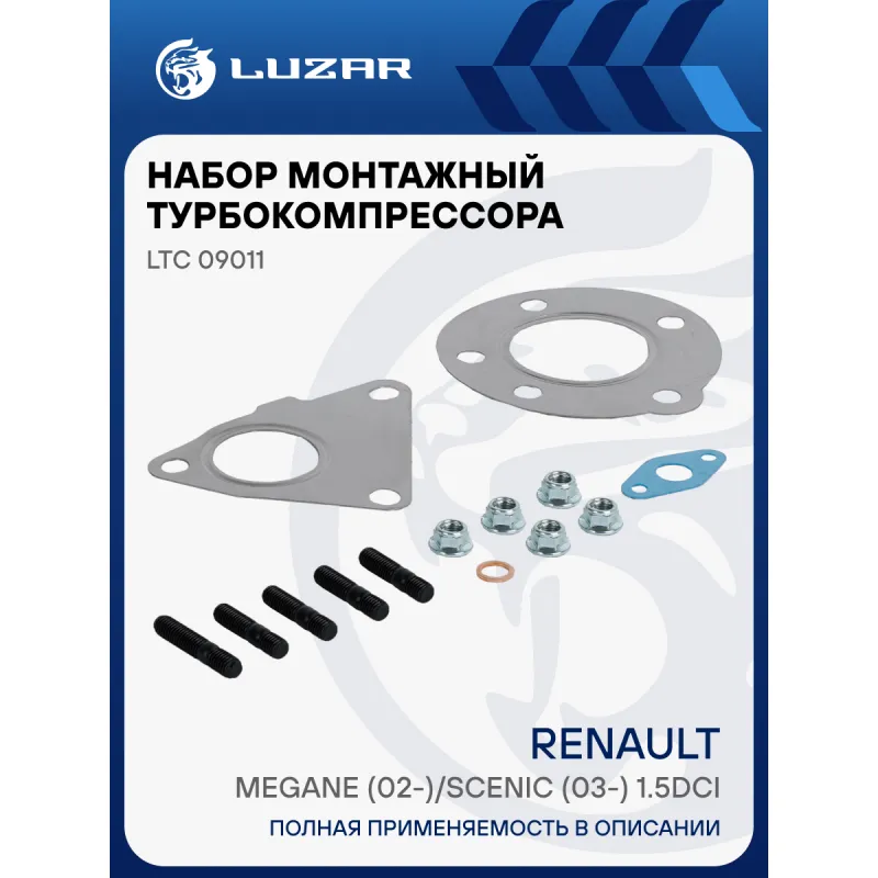 Набор монтажн. турбокомпр. для а/м Renault Megane (02-)/Scenic (03-) 1.5dCi [K9K] (тип BV39) (прокл.,шпил.,гайк.) Характеристики: Артикул: LTC 09011 OEM номера: 1441100Q0FEX, 82004-05203, 7701476883, 8200507856, 8200578381, 8200625683, 1441100Q0F, 7700476883, 7711368560 Количество на автомобиль: 1 Материал: Сталь, медь, безасбестовый картон Сопутствующий товар: Актуатор: LTC 0901 Подходит для авто: Renault Scenic II (04-), Megane II (02-), Clio III (05-) Для проверки применяемости отправьте VIN автомобиля через вкладку "Есть вопросы о товаре?" Комплектация: Прокладка медная - 1 шт Прокладка картонная безасбестовая - 1 шт Прокладка стальная - 2 шт Шпилька - 5 шт Гайка - 5 шт Гарантия: от 1 года.