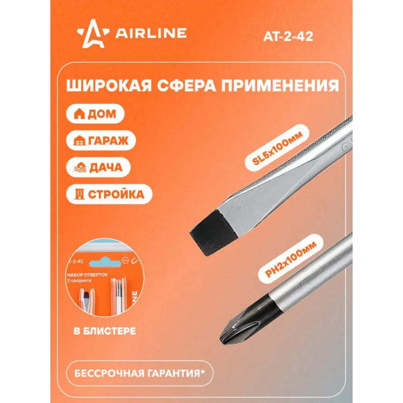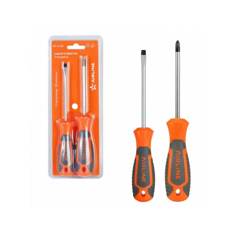 Набор отверток 2 предмета (SL5х100мм,PH2х100мм), блистер Описание: Набор отверток 2 шт крестовые и прямые AIRLINE AT-2-42. Сочетание твёрдых и мягких элементов эргономичной рукоятки оптимально распределяет усилие, прилагаемое к инструменту, и предотвращает проскальзывание. Эргономичный дизайн облегчает работу. Отвёртки AIRLINE удобно подвешиваются за специальное отверстие. Лезвие отвёрток AIRLINE изготовлено из хром-ванадиевой стали, жало подвержено индукционной закалке и фосфатировано. - Магнитный наконечник; - Подойдут для дома, для гаража, для любых бытовых задач, многофункциональная, для ремонта, для сборки мебели, для автомобиля; - Размер отверток из набора: SL5x100мм, PH2x100мм; - Материал стержня - CRV; - Материал рукоятки - двухкомпонентная, прорезиненная; - Подвес инструмента; Товар официального производителя AIRLINE. Отлично подойдет в качестве практичного подарка мужчинам, женщинам, автомобилисту, папе, отцу, мужу, парню и другу на Новый год, день рождения и без повода, незаменимая вещь для дома, автосервиса, для профессионального использования. Характеристики: Артикул: AT-2-42 OEM номера: 39542 Размер: SL5x100мм, PH2x100мм Материал стержня: CRV Материал рукоятки: двухкомпонентная Комплектация: Отвёртка - 2 шт Гарантия: от 1 года.