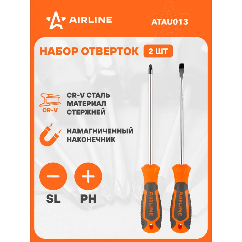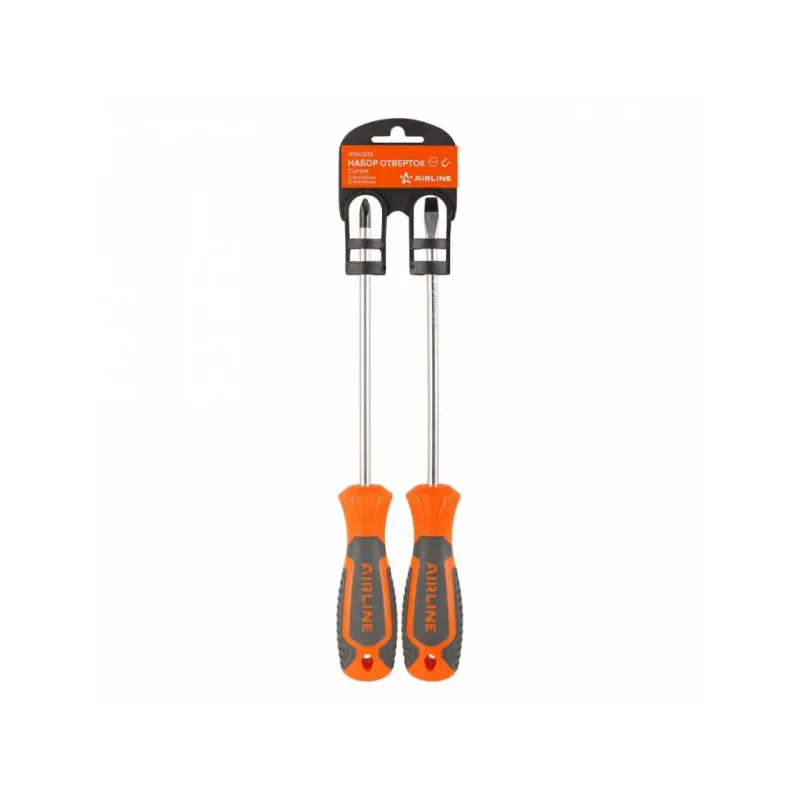 Набор отвёрток 2 пр. (SL6x150mm, PH2x150mm), пласт.подвес Описание: Набор отверток 2 шт крестовые и прямые AIRLINE ATAU013. Сочетание твёрдых и мягких элементов эргономичной рукоятки оптимально распределяет усилие, прилагаемое к инструменту, и предотвращает проскальзывание. Эргономичный дизайн облегчает работу. Отвёртки AIRLINE удобно подвешиваются за специальное отверстие. Лезвие отвёрток AIRLINE изготовлено из хром-ванадиевой стали, жало подвержено индукционной закалке и фосфатировано. - Магнитный наконечник; - Подойдут для дома, для гаража, для любых бытовых задач, многофункциональная, для ремонта, для сборки мебели, для автомобиля; - Размер отверток из набора: SL6, PH2; - Материал стержня - CRV; - Материал рукоятки - двухкомпонентная, прорезиненная; - Подвес инструмента; Товар официального производителя AIRLINE. Отлично подойдет в качестве практичного подарка мужчинам, женщинам, автомобилисту, папе, отцу, мужу, парню и другу на Новый год, день рождения и без повода, незаменимая вещь для дома, автосервиса, для профессионального использования. Характеристики: Артикул: ATAU013 Размер: SL6, PH2 Длина жала отвёртки, мм: 150 Материал стержня: CRV Материал рукоятки: двухкомпонентная Комплектация: Отвёртка - 2 шт Гарантия: от 1 года.