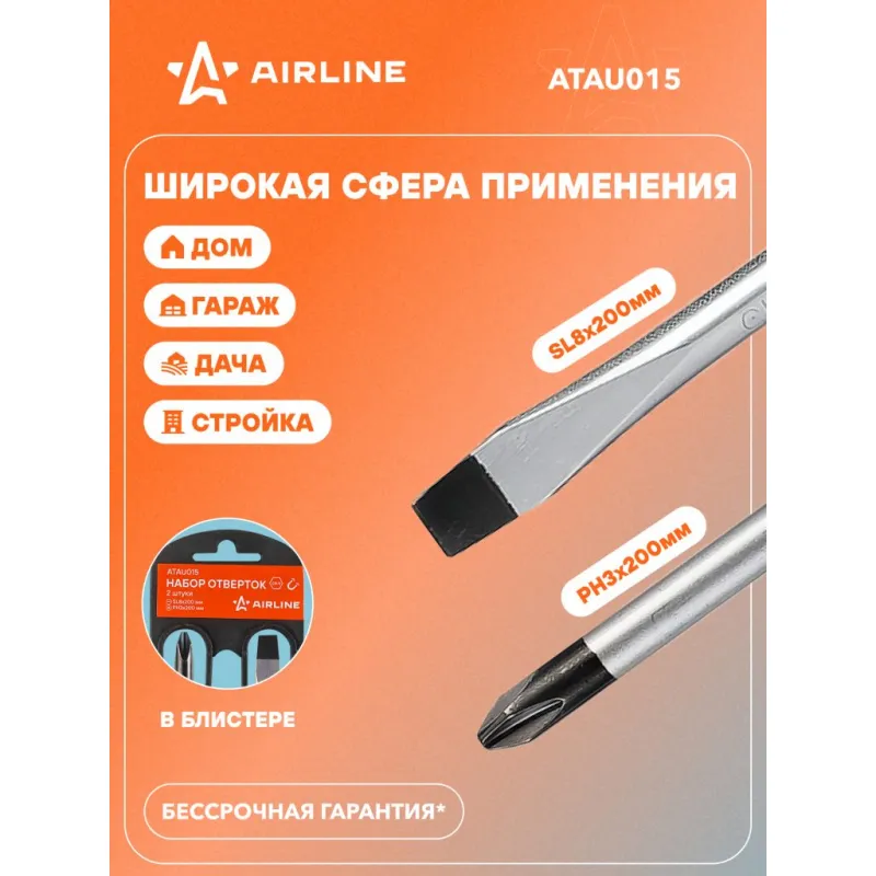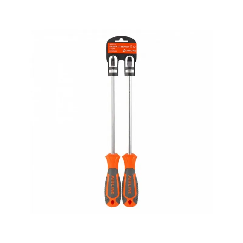 Набор отвёрток 2 пр. (SL8x200mm, PH3x200mm), пласт.подвес Описание: Набор отверток 2 шт крестовые и прямые AIRLINE ATAU015. Сочетание твёрдых и мягких элементов эргономичной рукоятки оптимально распределяет усилие, прилагаемое к инструменту, и предотвращает проскальзывание. Эргономичный дизайн облегчает работу. Отвёртки AIRLINE удобно подвешиваются за специальное отверстие. Лезвие отвёрток AIRLINE изготовлено из хром-ванадиевой стали, жало подвержено индукционной закалке и фосфатировано. - Магнитный наконечник; - Подойдут для дома, для гаража, для любых бытовых задач, многофункциональная, для ремонта, для сборки мебели, для автомобиля; - Размер отверток из набора: SL8, PH3; - Материал стержня - CRV; - Материал рукоятки - двухкомпонентная, прорезиненная; - Подвес инструмента; Товар официального производителя AIRLINE. Отлично подойдет в качестве практичного подарка мужчинам, женщинам, автомобилисту, папе, отцу, мужу, парню и другу на Новый год, день рождения и без повода, незаменимая вещь для дома, автосервиса, для профессионального использования. Характеристики: Артикул: ATAU015 Размер: SL8, PH3 Длина жала отвёртки, мм: 200 Материал стержня: CRV Материал рукоятки: двухкомпонентная Комплектация: Отвёртка - 2 шт Гарантия: от 1 года.