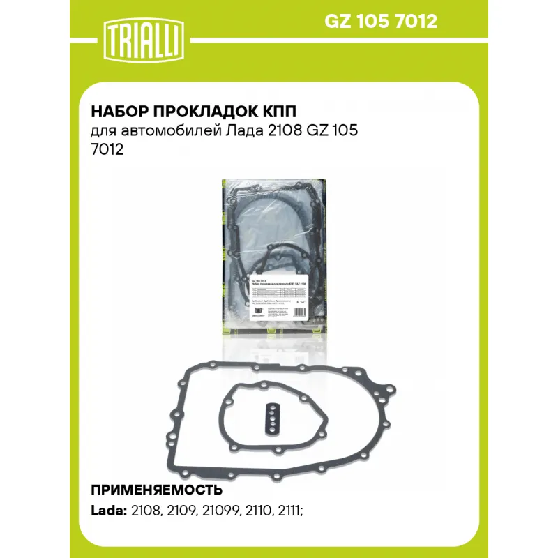 Набор прокладок КПП для автомобилей Лада 2108 Характеристики: Артикул: GZ 105 7012 OEM номера: 2108-1701018, 2108-1701203, 2108-1702091 Гарантийный срок: 2 года/60 000 км. Количество на автомобиль: 1 Сопутствующие товары:: GZ 101 7010,GZ 101 7011 Материал: Безасбестовый Трансмиссия: M ABS: - Подходит для авто: ВАЗ 2108, 2109, 21099, 21099, 2110, 2111, 2108, 2109, 21099 Для проверки применяемости отправьте VIN автомобиля через вкладку "Есть вопросы о товаре?" Гарантия: от 1 года.