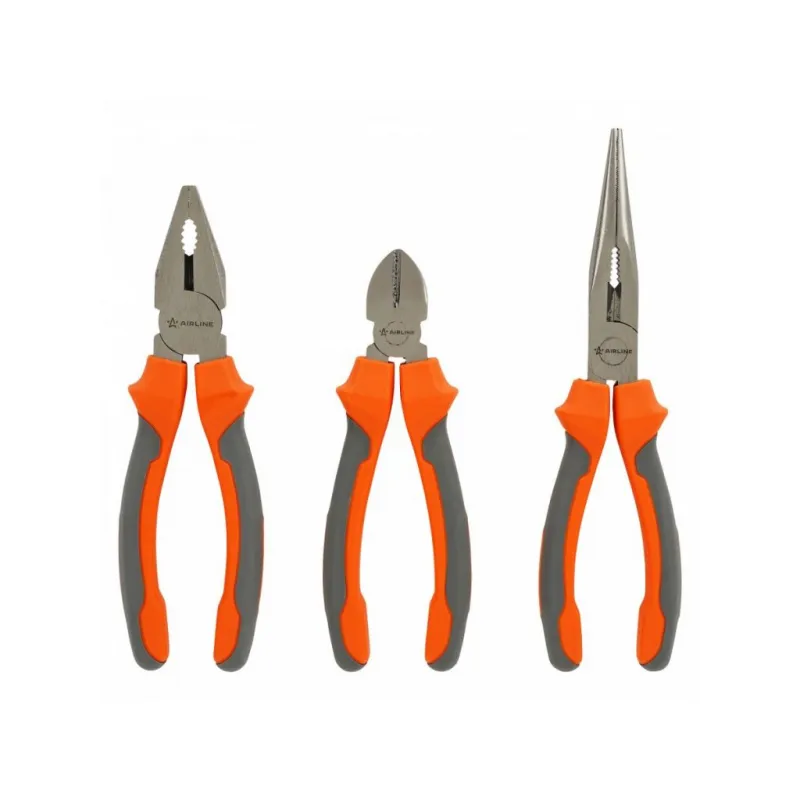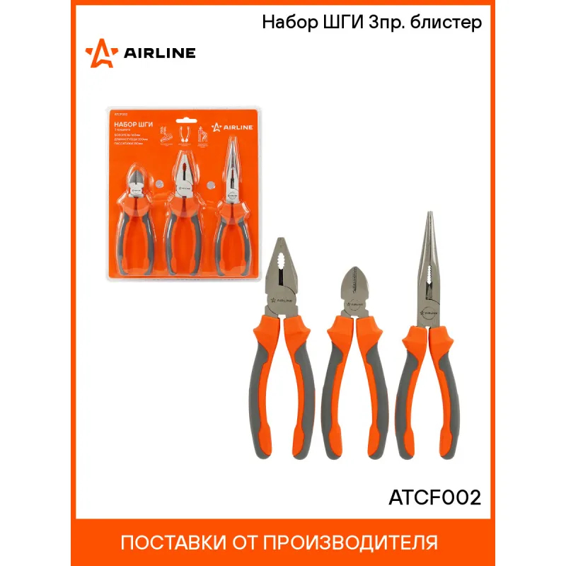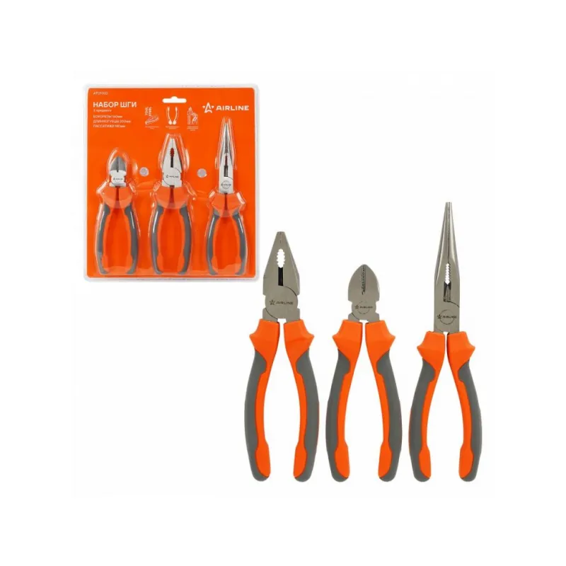 Набор ШГИ 3пр. (бокорезы 160мм, длинногубцы 200мм, пассатижи 180мм) блистер Описание: Двухкомпонентные эргономичные рукоятки шарнирно-губцевого инструмента AIRLINE создают комфортное ощущение при работе, а специальная форма гарантирует безопасность труда и снижение усталости при работе. Шарнирно-губцевый инструмент AIRLINE изготовлен из специальной высококачественной инструментальной стали. При производстве заготовки подвергаются закалке и отпуску, для улучшения рабочих характеристик инструментов. Режущие кромки подвергаются индукционной закалке. Применяется финишное покрытие двух типов: хромирование и фосфатирование. Характеристики: Артикул: ATCF002 Комплектация: Длинногубцы 180мм - 1 шт Пассатижи 180мм - 1 шт Бокорезы 160мм - 1 шт Гарантия: от 1 года.