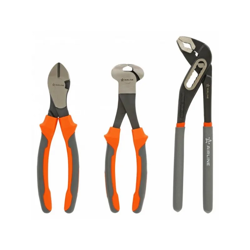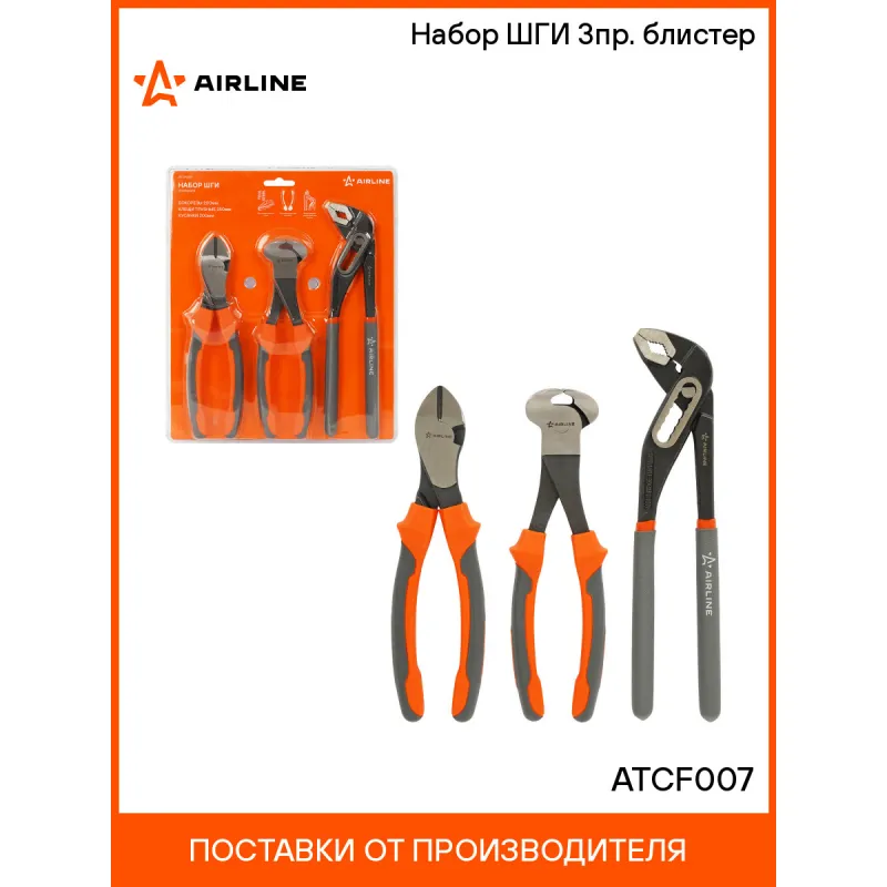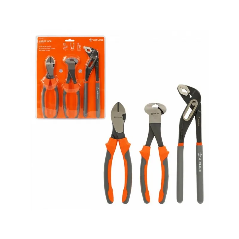 Набор ШГИ 3пр. (бокорезы 200мм, клещи трубные 250мм, кусачки 200мм) блистер Описание: Двухкомпонентные эргономичные рукоятки шарнирно-губцевого инструмента AIRLINE создают комфортное ощущение при работе, а специальная форма гарантирует безопасность труда и снижение усталости при работе. Шарнирно-губцевый инструмент AIRLINE изготовлен из специальной высококачественной инструментальной стали. При производстве заготовки подвергаются закалке и отпуску для улучшения рабочих характеристик инструментов. Режущие кромки подвергаются индукционной закалке. Применяется финишное покрытие двух типов: хромирование и фосфатирование. Характеристики: Артикул: ATCF007 Комплектация: Клещи трубные 250мм - 1 шт Кусачки торцевые 200мм - 1 шт Бокорезы 200мм - 1 шт Гарантия: от 1 года.