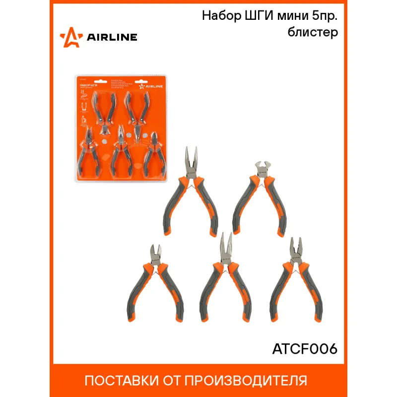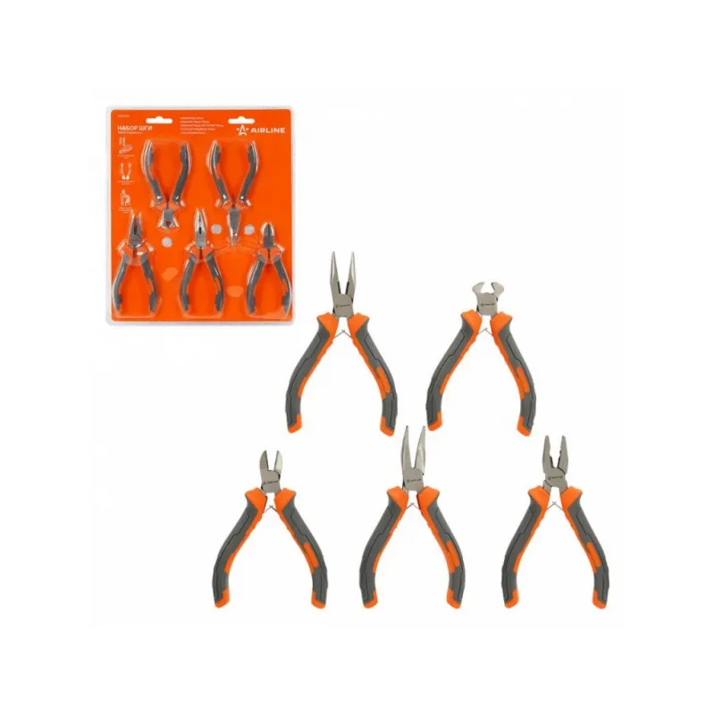 Набор ШГИ мини 5пр. (бокорезы, длинногубцы 2шт, кусачки, пассатижи 120мм) блистер Описание: Двухкомпонентные эргономичные рукоятки шарнирно-губцевого инструмента AIRLINE создают комфортное ощущение при работе, а специальная форма гарантирует безопасность труда и снижение усталости при работе. Шарнирно-губцевый инструмент AIRLINE изготовлен из специальной высококачественной инструментальной стали. При производстве заготовки подвергаются закалке и отпуску, для улучшения рабочих характеристик инструментов. Режущие кромки подвергаются индукционной закалке. Применяется финишное покрытие двух типов: хромирование и фосфатирование. Характеристики: Артикул: ATCF006 Комплектация: Бокорезы 120мм - 1 шт Кусачки торцевые 105мм - 1 шт Пассатижи 160мм - 1 шт Длинногубцы 120мм - 1 шт Длинногубцы загнутые 120мм - 1 шт Гарантия: от 1 года.