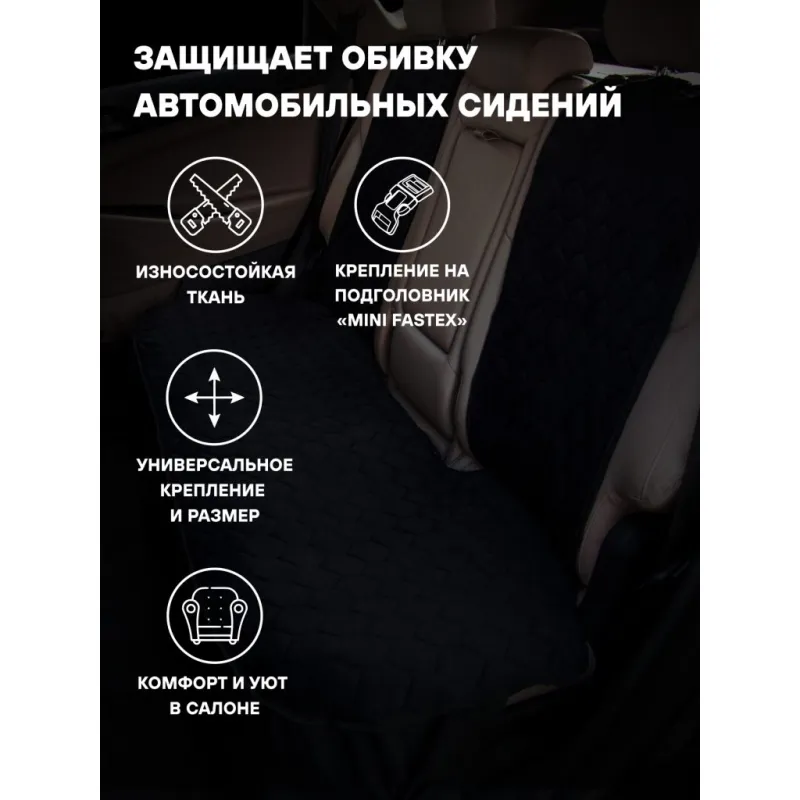 Накидка "Алькантара", задняя (3 предмета), черная, универсальная Описание: Комплект накидок на заднее сиденье «Алькантара» ASC-B-01 бренда Airline – универсален и подходит практически для любой марки и модели автомобиля. Накидки сшиты из износоустойчивой ворсовой мебельной ткани и защищают штатную обивку от истирания и выцветания. Идеально подходят к кожаному салону, обеспечивая комфортную температуру при контакте с сиденьем в холодную и жаркую погоду. Благодаря своей форме накидки позволяют без затруднений надевать их на кресла любого типа, не прибегая к демонтажу подголовников и подлокотников, а так же не препятствует раскрытию подушек безопасности. Все модели, имеют универсальную систему крепления позволяющую применять изделие на 99% существующего автопарка России. Комплект состоит из накидок на заднее сиденье из трех частей. Стеганый дизайн придает уют салону автомобиля. Особенности и преимущества: - износостойкая ворсовая ткань; - защищает обивку автомобильных сидений от истирания; - универсальное крепление и размер, удобные застежки на направляющие подголовника; - не линяет; - не мешает раскрытию подушек безопасности; - черный, немаркий цвет; - комфорт и уют в салоне; Накидка на сидение автомобиля является необходимым аксессуаром для всех автомобилей. Накидка такого типа будет отличным подарком автовладельцу на 23 февраля, 8 марта, Новый год, мужчине, женщине, мужу, жене, парню, девушке. Характеристики: Артикул: ASC-B-01 Длина спинки, мм: 780 Ширина спинки, мм: 340 Подкладка на обороте: смесовая ткань Толщина подложки, мм: 8 Размер: универсальный Рисунок (стёжка): соты Материал подложки: ВПЭ Вид крепления: резинки, фастексы Место установки: сиденье заднее Цвет: черный Длина сидушки, мм: 340 Ширина сидушки, мм: 1330 Комплектация: Накидка на заднее сиденье - 1 шт Накидка на спинку заднего сиденья - 2 шт Сумка ПВХ с вкладышем - 1 шт Гарантия: от 1 года.