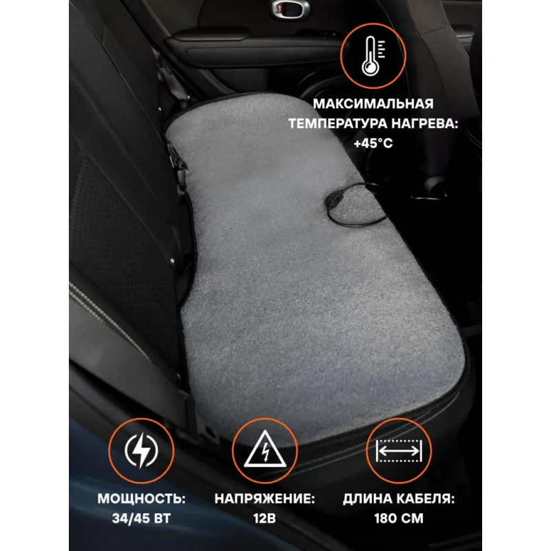 Накидка с подогревом на заднее сиденье 12 В, 35/45Вт, 128*49 см, искусств. мех, серая Описание: Накидка (подушка) на заднее сиденье с подогревом ADHC008 бренда Airline – универсальна и подходит для любой марки и модели автомобиля. Применяется для дополнительного обогрева пассажиров на заднем сиденье при пониженных температурах. Представляет собой накидку на сиденье из искусственного меха (полиэстера) с нагревательным элементом. Питание от бортовой сети 12V через гнездо прикуривателя. Накидка оснащена пультом для регулировки нагрева. Накидка с подогревом предназначена для установки на задний ряд сидений автомобиля. Она имеет прямоугольную продолговатую форму, а также универсальный размер, который позволяет использовать изделие в салоне любого авто. Изделие имеет особую противоскользящую поверхность, а также ворсистую, приятную на ощупь внешнюю сторону накидки. Система регулировки нагрева позволяет настраивать необходимую мощность температуры с максимальным порогом +45C. Для безопасности использования накидки оснащены термистором, который отключает накидку при нагреве +65С. Преимущества: -работает от бортовой сети 12V, -мощность 35/45Вт, -легко устанавливается, -экологичный и износоустойчивый материал, -максимальная температура нагрева +45C, -универсальное крепление, -пульт регулировки нагрева (три положения). Накидка на сидение автомобиля является необходимым аксессуаром для всех автомобилей. Накидка такого типа будет отличным подарком автовладельцу на 23 февраля, 8 марта, Новый год, мужчине, женщине, мужу, жене, парню, девушке. Характеристики: Артикул: ADHC008 Максимальная температура нагрева, °C: 45 Морозостойкость провода,°C: -40 Напряжение питающей сети, В: 12 Мощность, Вт: 34/45 Размер: универсальный Длина кабеля питания, мм: 1800 Термистор,°C: 65 Терморегулятор (регулировка t нагрева): да Предохранитель, А: 7 Сила тока, А: 3.75 Длина, мм: 1280 Ширина, мм: 490 Место нагрева: спинка, сидушка Сидушка с подогревом: да Подкладка: да Комплектация: Накидка - 1 шт Пакет с подвесом - 1 шт Гарантия: от 1 года.