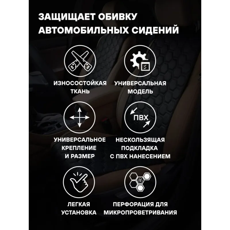 Накидки "Алькантара", передние (2 шт.), экокожа с перфорацией, черные Описание: Накидки сшиты из современой экокожи и защищают штатную обивку от истирания и выцветания. Имеют стеганый дизайн с оригинальным рисунком, что придает салону домашний комфорт и уют; Благодаря своей форме накидки позволяют без затруднений надевать их на кресла любого типа, не прибегая к демонтажу подголовников и подлокотников, а так же не препятствует раскрытию подушек безопасности. Все модели, имеют универсальную систему крепления позволяющую применять изделие на 99% существующего автопарка России. Комплект состоит из двух накидок на переднии сиденья. Характеристики: Артикул: ACS-SF-01 Длина спинки, мм: 750 Ширина спинки, мм: 340 Подкладка на обороте: смесовая ткань Толщина подложки, мм: 8 Размер: универсальный Рисунок (стёжка): соты Материал подложки: ВПЭ Вид крепления: резинки, фастексы Место установки: сиденье передние Цвет: черный Длина сидушки, мм: 750 Ширина сидушки, мм: 340 Комплектация: Накидка на сиденье - 2 шт Сумка ПВХ - 1 шт Гарантия: от 1 года.