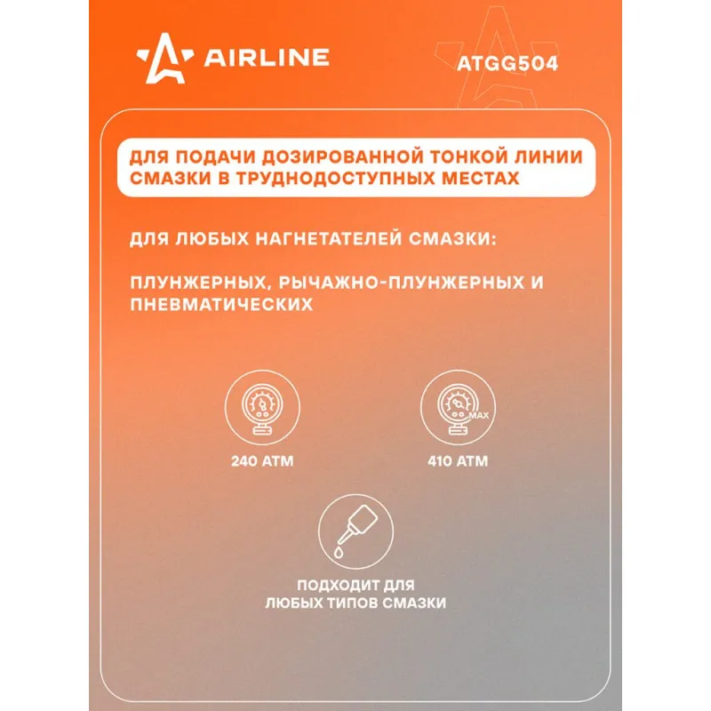 Наконечник-насадка для плунжерного шприца игольчатый 135мм Описание: Наконечник игольчатый быстросъемный 135мм для плунжерного шприца выполнен из высокопрочного металла. Предназначен для подачи дозированной тонкой линии смазки в труднодоступных местах. Имеет быстросъёмное соединение, то есть крепится к наконечнику шприца. Применяется с любыми типами нагнетателей смазки: плунжерных, рычажно-плунжерных и пневматических. Подходит для любых типов смазки. Характеристики: Артикул: ATGG504 Длина, мм: 135 Материал: Сталь Присоединительная резьба: нет Рабочее давление, атм: 240 Максимальное давление, aтм: 410 Комплектация: Наконечник игольчатый быстросъемный 135мм в пакете со стикером - 1 шт Гарантия: от 1 года.