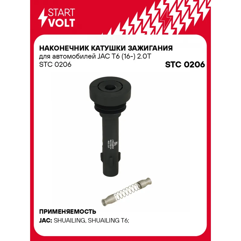 Наконечник катушки зажигания для автомобилей JAC T6 (16-) 2.0T Характеристики: Артикул: STC 0206 OEM номера: F01R00A099, 1026102GD190 Материал изготовления: Силикон Количество на автомобиль: 4 Комплектация: Наконечник катушки зажигания - 1 шт Паспорт изделия/гарантийный талон - 1 шт Гарантия: от 1 года.