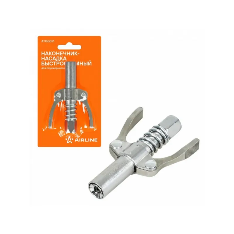 Наконечник-насадка для плунжерного шприца быстросъемн., блистер Описание: Наконечник-насадка быстросъемный для плунжерного шприца AIRLINE (ATGG521) разработан для удобства и повышения эффективности работы. Его ключевая особенность — наличие специальных рычажков, которые значительно ускоряют процесс присоединения и отсоединения наконечника от пресс-масленки. Для установки наконечника достаточно нажать на рычажки и присоединить его к пресс-масленке. Чтобы снять наконечник, также необходимо нажать на рычажки и аккуратно отсоединить его. Такая конструкция позволяет экономить время и переходить от одного узла к другому с минимальными усилиями. Наконечник навинчивается на шланг или трубку с присоединительной резьбой NPT 1/8-27, обеспечивая надежное и герметичное соединение. Этот аксессуар идеально подходит для использования с плунжерными шприцами AIRLINE, делая процесс смазки оборудования и агрегатов более быстрым и комфортным. Благодаря своей практичности и надежности, быстросъемный наконечник станет незаменимым инструментом для профессионалов, ценящих качество и скорость выполнения работ. Характеристики: Артикул: ATGG521 Материал: Металл Длина, мм: 90 Присоединительная резьба: NPT 1/8-27 Рабочее давление, атм: 410 Максимальное давление, aтм: 545 Комплектация: Наконечник-насадка быстросъемный - 1 шт Гарантия: от 1 года.