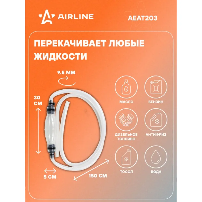 Насос для ручной перекачки топлива "Груша" 1.5м с клапаном, прозрачный Описание: Насос для ручной перекачки топлива "Груша" с клапаном используется для перекачки топлива, масел и технических жидкостей AEAT203 от бренда AIRLINE - имеет специальный клапан, пропускающий перекачиваемое топливо только в одном направлении. Механический насос автомобильный сделан из маслобензостойкой резины и подходит для технических жидкостей, таких как: дизельное топливо/дизель, керосин, минеральные и синтетические масла, концентраты охлаждающих жидкостей и др. Подходит для перекачки и замены масла. Применение! Для перекачки бензина или дизельного топлива нужно один конец шланга окунуть в канистру или бензобак автомобиля и ритмично сжимать и разжимать "грушу". На груше есть стрелка, которая показывает направление перекачки топлива. Главное условие – емкость, откуда перекачивают жидкость, должна быть выше ответной части (выше емкости, в которую перекачивают жидкость). Длина шланга - . Возможно применение насоса для откачки масла в транспортных средствах: мотоциклы, автомобили, квадроциклы, лодки, а также в промышленном/медицинском оборудовании. НЕ РЕКОМЕНДУЕТСЯ применять насос для ГСМ для перекачивания воды, жидкостей на её основе, а также сильных кислот и других агрессивных жидкостей. Характеристики: Артикул: AEAT203 Диаметр, мм: 9,5 Длина, см: 150 Комплектация: Насос для ручной перекачки топлива "Груша" 1.5м - 1 шт Пакет с навершием - 1 шт Гарантия: от 1 года.