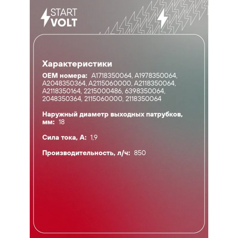 Насос электрический (помпа) для автомобилей Mercedes-Benz GLK X204 (08-) Sprinter W909 (13-) 2.1CDI Характеристики: Артикул: SEP 1509 OEM номера: A1718350064, A1978350064, A2048350364, A2115060000, A2118350064, A2118350164, 2215000486, 6398350064, 2048350364, 2115060000, 2118350064, 2118350164, 2118350264, 2118350364, A2118350264, A2118350364, A2215000486, A6398350064, 1718350064, 1978350064, 2118350264, 2E0965521, 2E0965559, 0392023004 Наружный диаметр выходных патрубков, мм: 18 Количество на автомобиль: 1 Сила тока, А: 1.9 Производительность, л/ч: 850 Подходит для авто: Mercedes-Benz Sprinter (06-), GLC (15-), E-Class W212 (09-), C-class W205 (14-), E-Class W212 (09-), CLA C117 (13-), B-Class W246 (13-), C-class W205 (14-), A-Class W176 (12-) Volkswagen Crafter (06-) Для проверки применяемости отправьте VIN автомобиля через вкладку "Есть вопросы о товаре?" Комплектация: Насос электрический (помпа) - 1 шт Кронштейн Паспорт изделия/гарантийный талон Гарантия: от 1 года.