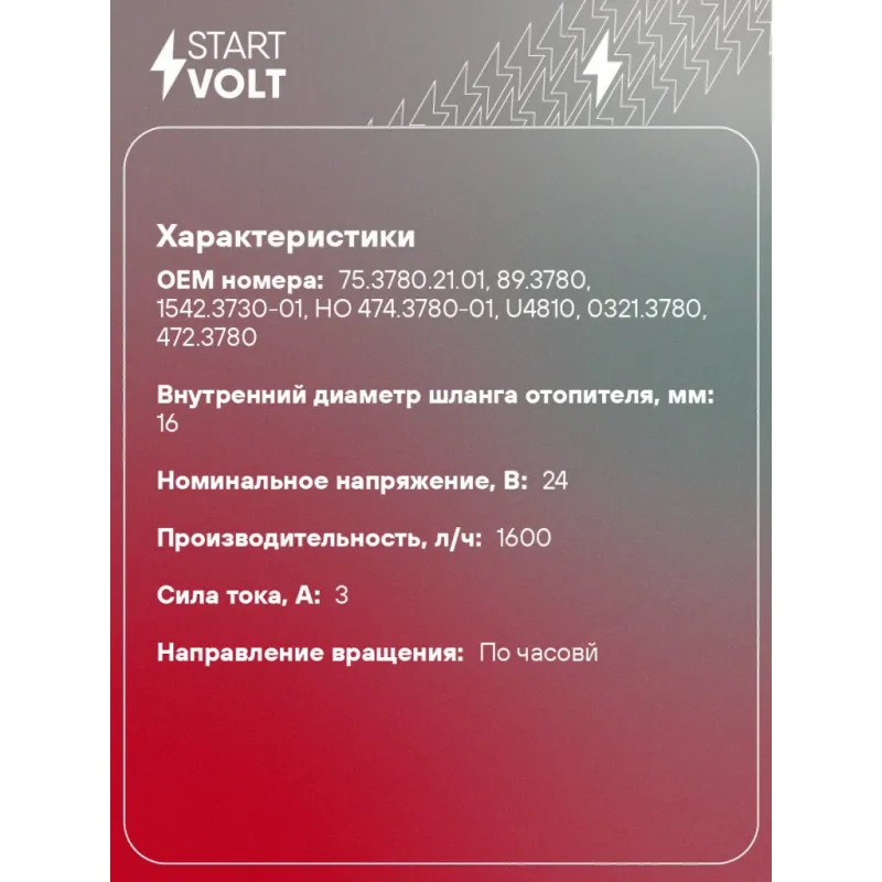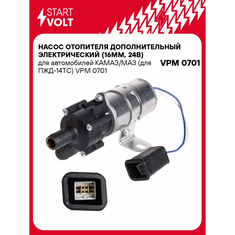 Насос отопителя дополнительный электрический (16мм, 24В) для автомобилей КАМАЗ/МАЗ (для ПЖД-14ТС) Характеристики: Артикул: VPM 0701 OEM номера: 75.3780.21.01, 89.3780, 1542.3730-01, НО 474.3780-01, U4810, 0321.3780, 472.3780 Номинальное напряжение, В: 24 Производительность, л/ч: 1600 Сила тока, А: 3 Направление вращения: по часовй Внутренний диаметр шланга отопителя, мм: 16 Количество на автомобиль: 1 Комплектация: Насос отопителя дополнительный - 1 шт Паспорт изделия/гарантийный талон - 1 шт Гарантия: от 1 года.