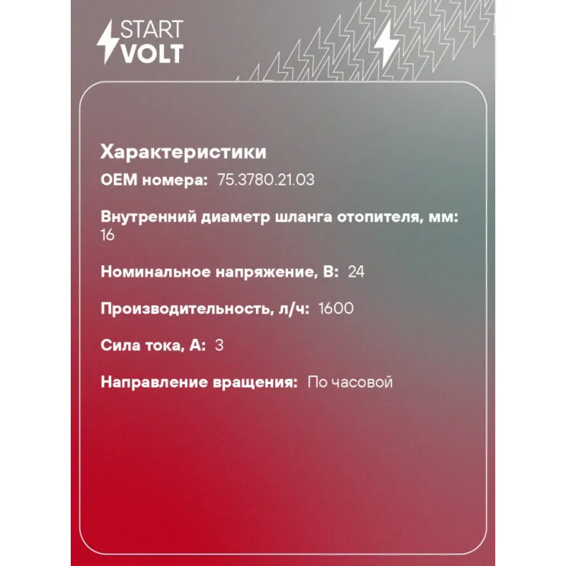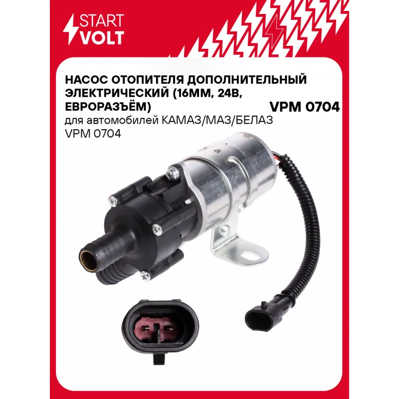 Насос отопителя дополнительный электрический (16мм, 24В, евроразъём) для автомобилей КАМАЗ/МАЗ/БЕЛАЗ Характеристики: Артикул: VPM 0704 OEM номера: 75.3780.21.03 Номинальное напряжение, В: 24 Производительность, л/ч: 1600 Сила тока, А: 3 Направление вращения: по часовой Внутренний диаметр шланга отопителя, мм: 16 Количество на автомобиль: 1 Комплектация: Паспорт изделия/гарантийный талон - 1 шт Насос отопителя дополнительный - 1 шт Гарантия: от 1 года.