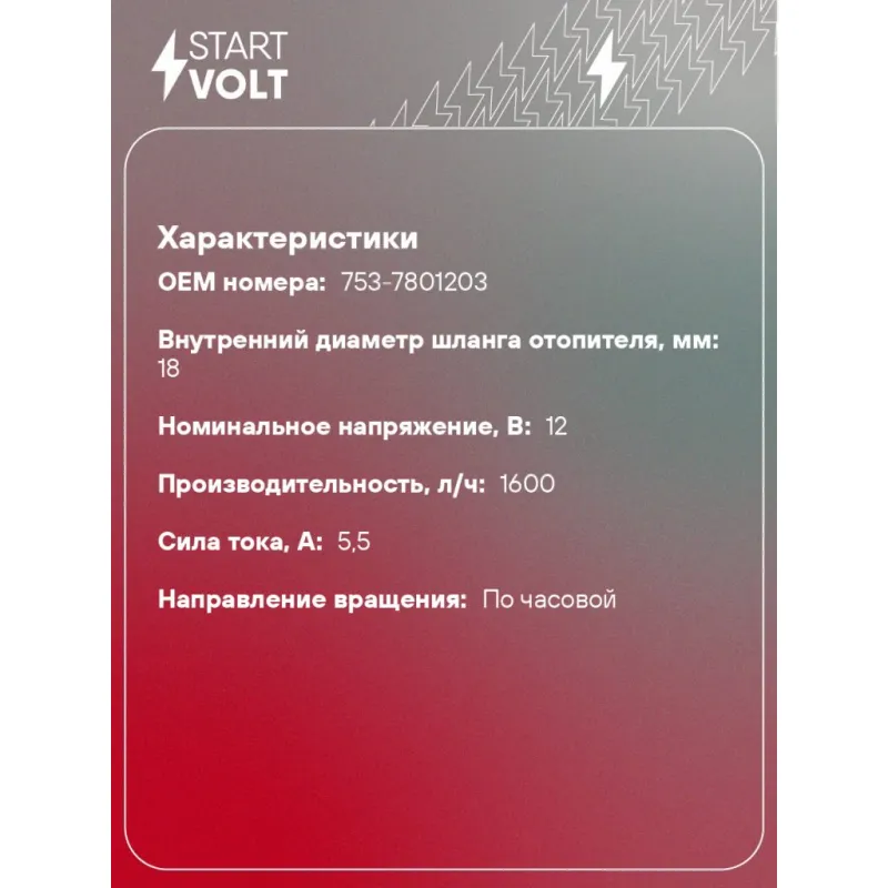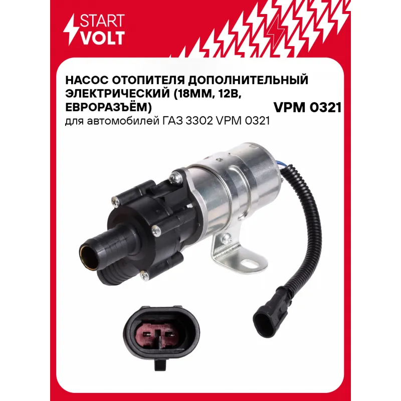 Насос отопителя дополнительный электрический (18мм, 12В, евроразъём) для автомобилей ГАЗ 3302 Характеристики: Артикул: VPM 0321 OEM номера: 753-7801203 Номинальное напряжение, В: 12 Производительность, л/ч: 1600 Сила тока, А: 5,5 Направление вращения: по часовой Внутренний диаметр шланга отопителя, мм: 18 Количество на автомобиль: 1 Комплектация: Паспорт изделия/гарантийный талон - 1 шт Насос отопителя дополнительный - 1 шт Гарантия: от 1 года.